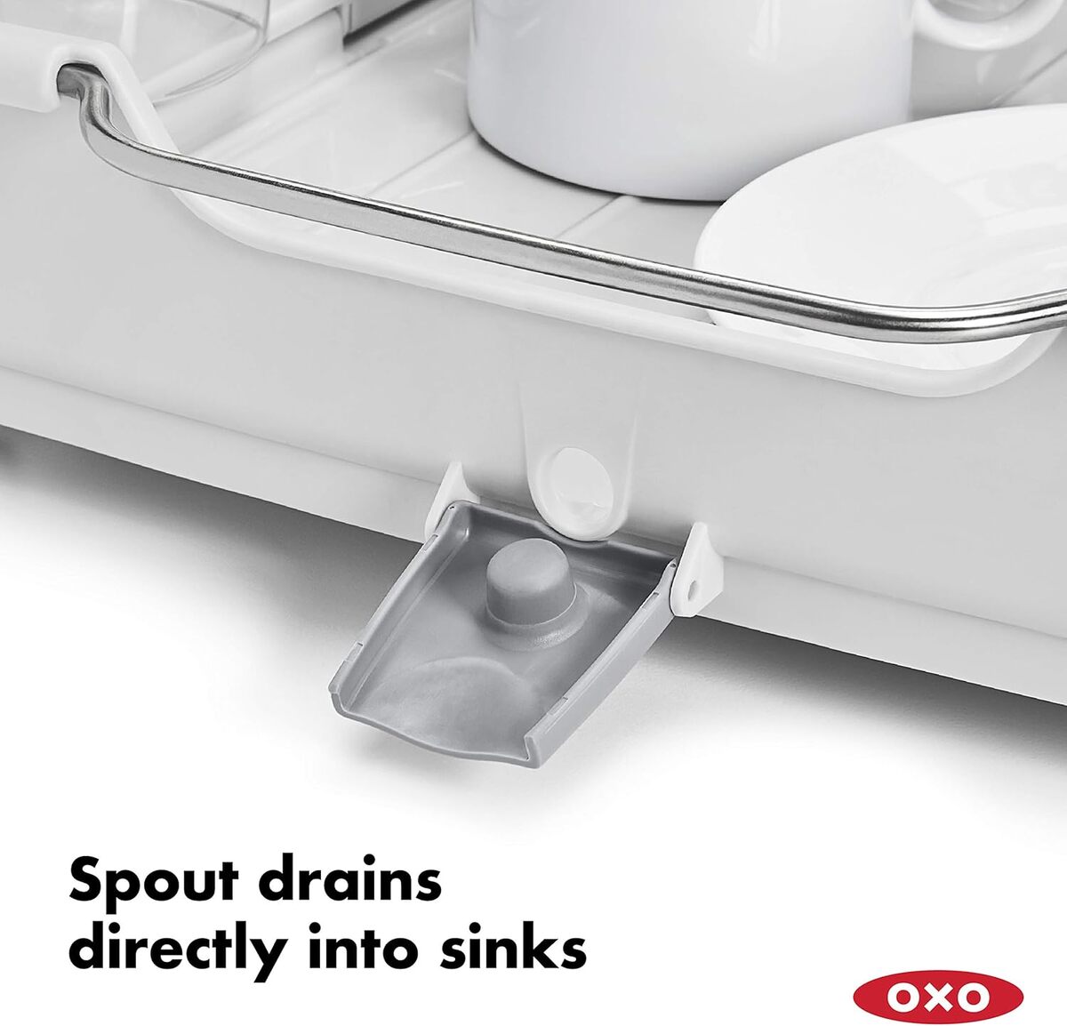 Legs fold out to elevate Dish Rack and spout opens to drain directly into sink.