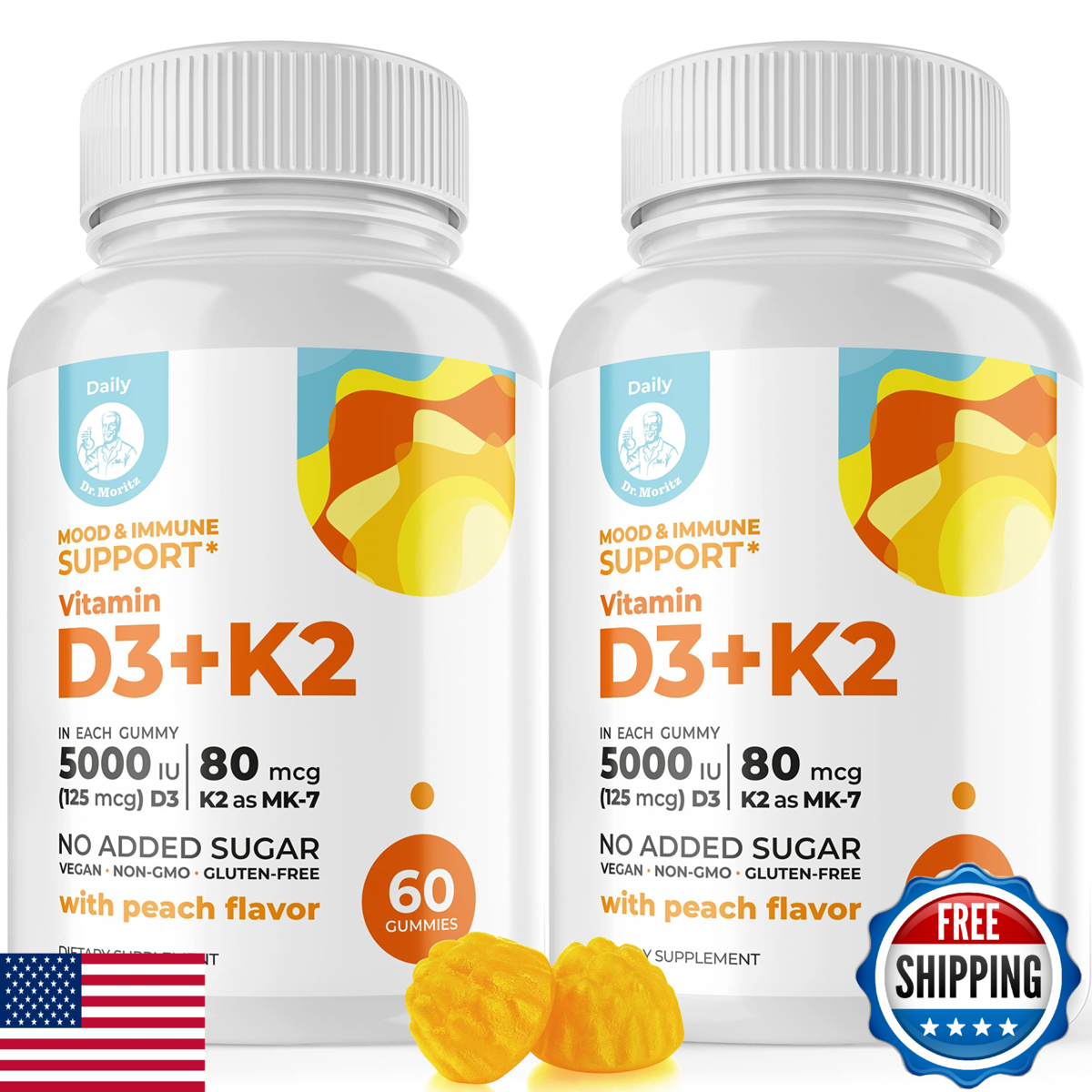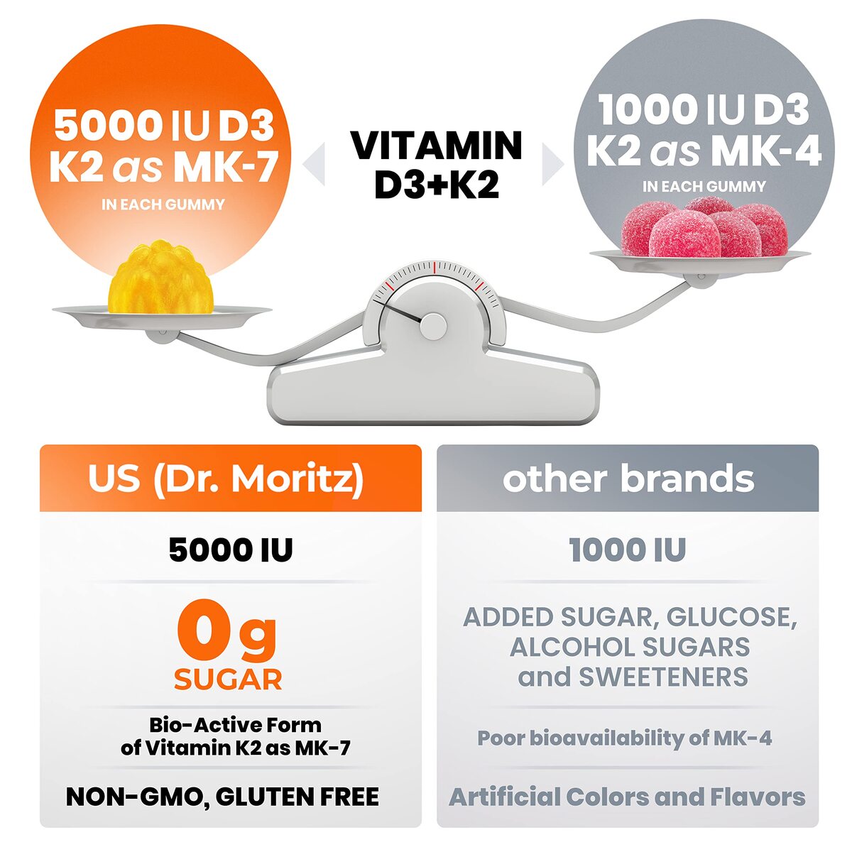 Chewable Vitamin K2 D3 Gummies promote the immune system, and facilitate calcium phosphorus balance in the blood, which is essential to keeping strong teeth, bones, muscles, and joints *,Instead of unpleasant vitamin D3 K2 capsules or softgels, try SUGAR-free, non-GMO, gluten dairy free, vegetarian gummies with delicious Peach flavor,Vitamin D3 (cholecalciferol) is the healthy, most easily absorbed form of vitamin D; 5000 IU gummies surpass the Daily Value for people with higher Vitamin D needs or deficiency,Vitamin K2 80mg as MK-7 (menaquinone-7) is the most bioactive bioavailable form of vitamin K; Vit D3 is more effective with K2 to help with optimal calcium absorption and distribution in the body *,Dr. Moritz D3 K2 vitamin 5000 IU are made in Germany according to rigorous quality standards, using only the best ingredients free of sugar, dairy, gluten, gelatin, and common allergens