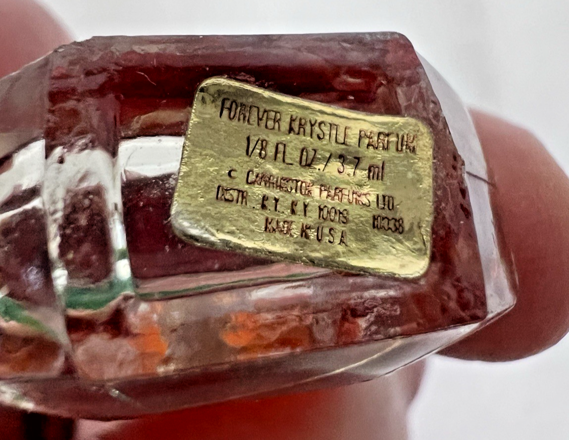 Miniature Carrington Forever Krystle Eau de Parfum Perfume Crystal Bottle 2". Miniature Carrington Forever Krystle parfum perfume bottle measures approx. 2" tall, appears full 1/8 fluid ounce. See pictures.
