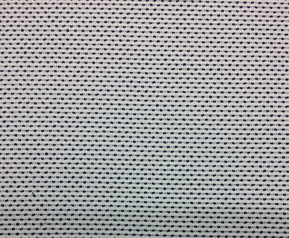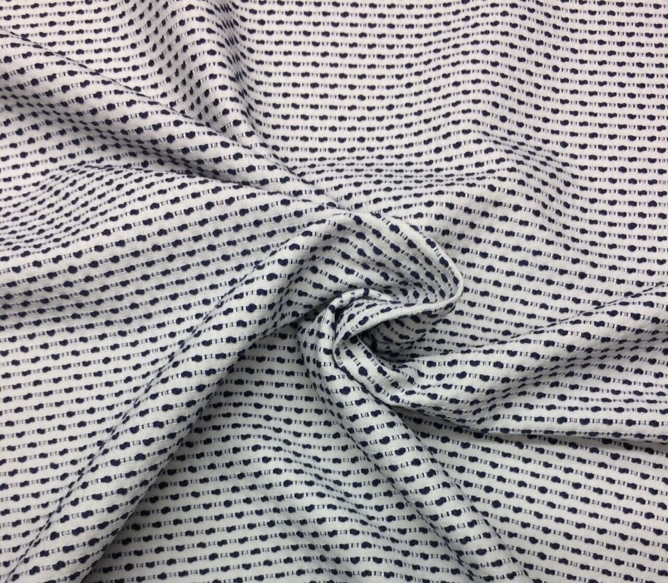 THIS FABRIC IS WOVEN OF SOFT, LIGHTLY RIBBED POLYESTER IN CASUAL STRIPES DOTTED WITH TWISTS OF INK BLUE COLOR ON AN OFF-WHITE GROUND