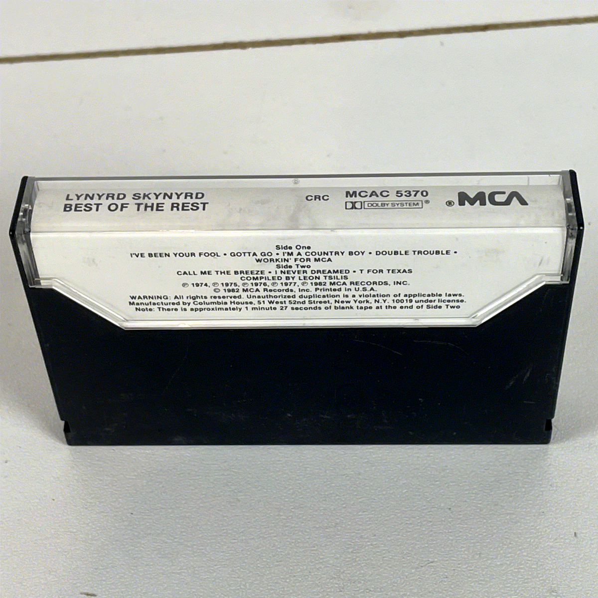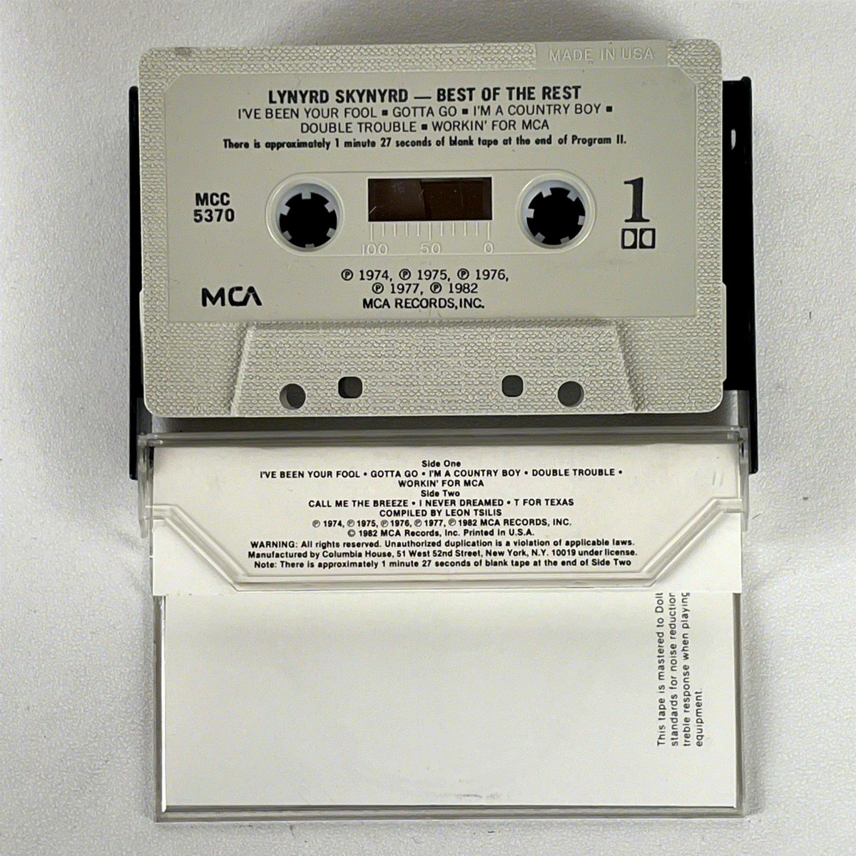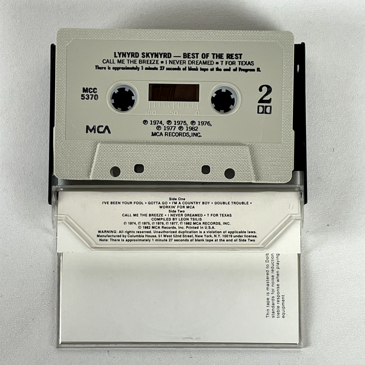 Released in 1982 by MCA Records, this cassette showcases the powerful songwriting and distinctive sound that defined Lynyrd Skynyrd's career. The album was compiled by Leon Tsilis and features a standard tape type, mastered to Dolby B standards for optimal sound reproduction. The distinct Columbia House (CRC) designation further adds to its unique identity within the band's discography. This collection is a must-have for enthusiasts of classic rock and Lynyrd Skynyrd's enduring legacy.