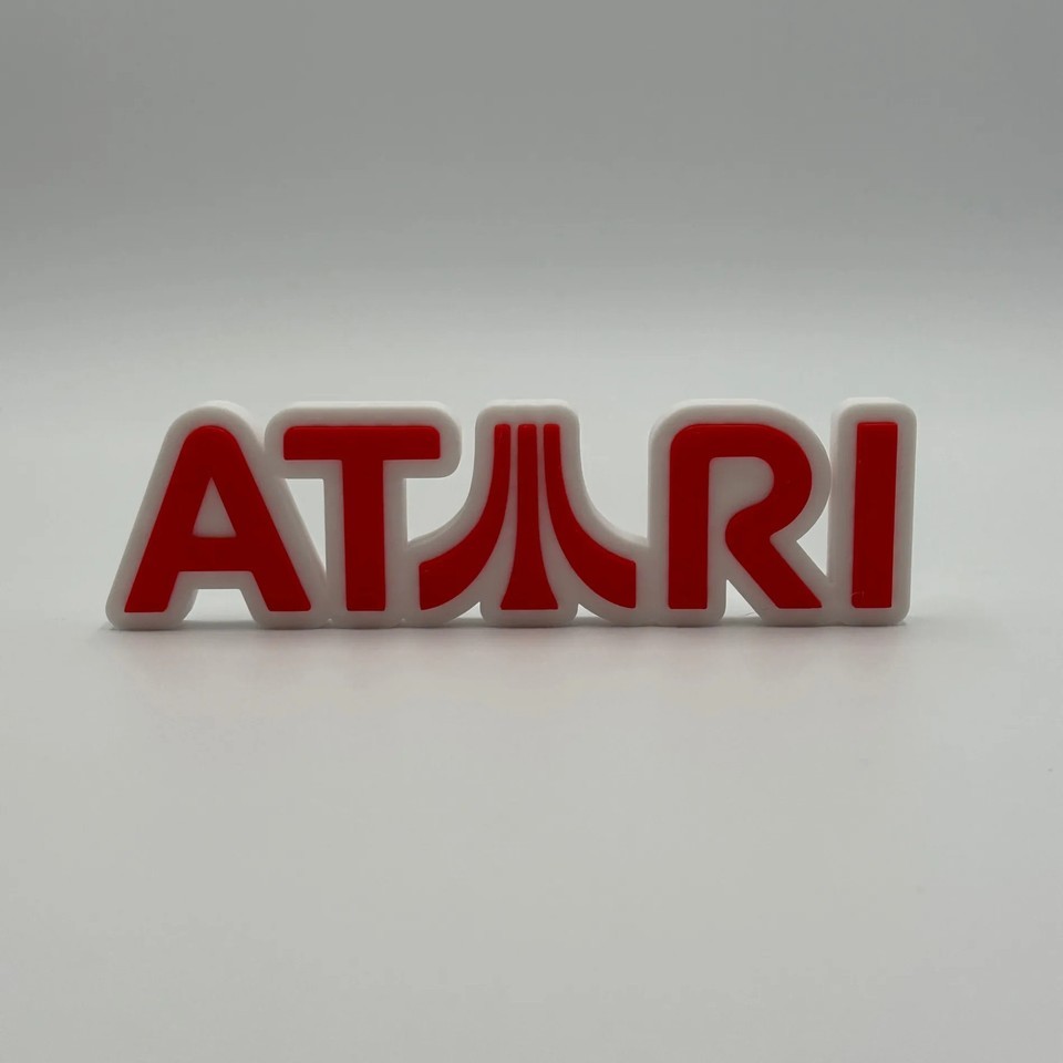 This 3D printed Atari logo sign is a vibrant display piece for any retro gaming enthusiast or collector. Featuring the iconic Atari name and 'Fuji' logo, the sign is crafted with a bold red finish and a clean white backing, creating a striking three-dimensional effect. Measuring approximately 8 inches in length, this sign is ideal for decorating game rooms, offices, or entertainment spaces. This newly produced item is perfect for adding a nostalgic touch to your decor.