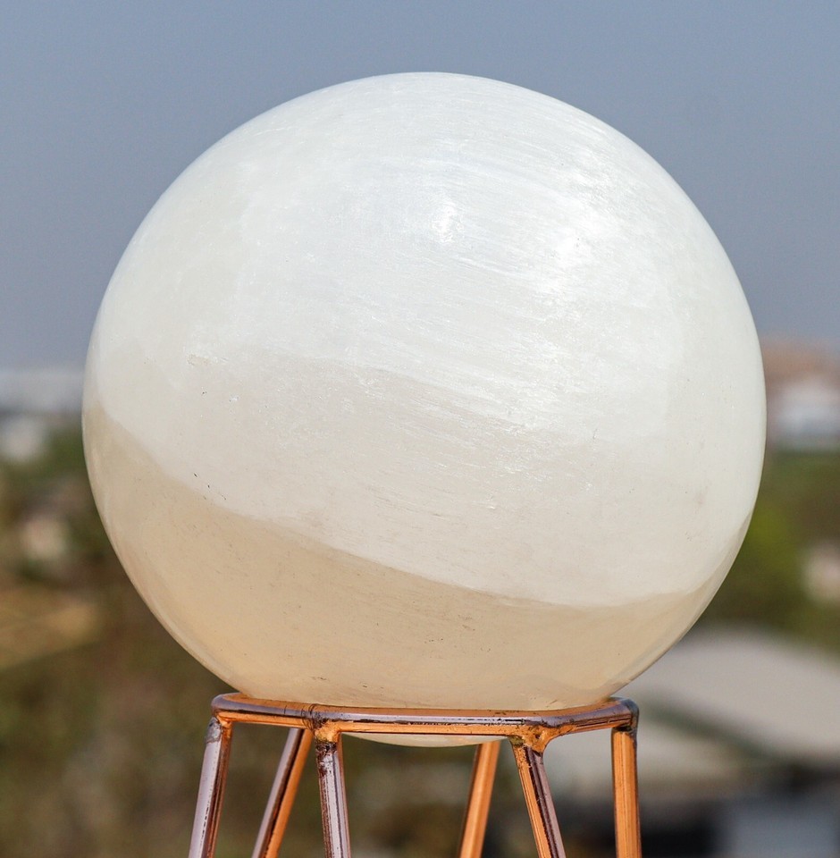 Hand Carved Raw 85mm Natural Polished White Selenite Crystal Quartz Healing Stone Sphere Specimen For Healing, Fengshui, Reiki, Aura, Meditation, Metaphysical, Decoration and Minerals Specimen with metal stand.