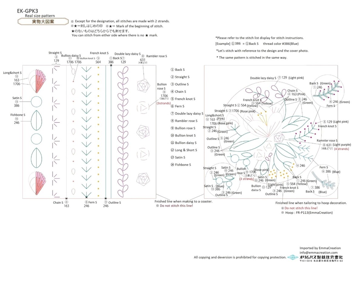 Olympus Garden Party First French Embroidery Kit Level 3 GPK-3. This embroidery stitch learning kit level three teaches you 14 advanced level stitches. It contains 100 percent cotton embroidery cloth in 13cm x 26cm with pre-printed patterns for practice, six colors of Cotton No 25 Embroidery floss, needle and instructions. Difficulty Level: Beginner. Estimated production time: 7 hours. Fabric Size (H x W): Approx. 5.1 x 10.2 inches (13 x 26 cm). Item Number: GPK-3. CHK-EK-GPK3