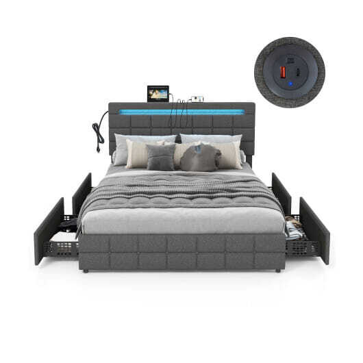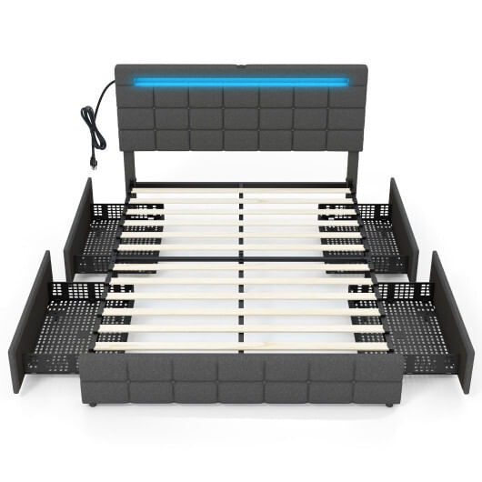 Upholstered Queen LED Bed Frame with Headboard and 4 Drawers-Queen Size - Color: Gray - Size: Queen Size