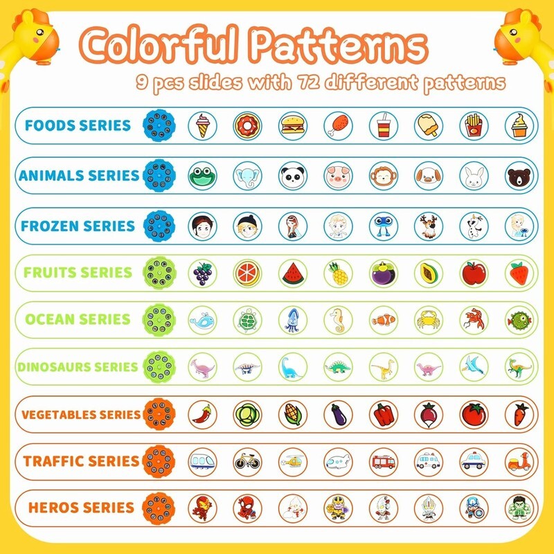Trace and draw projector toy come with 9 slides, (Fruits, Vegetables, Foods, Animals, Heros, Frozen,Dinosaurs, Ocean, Traffic), 72 different patterns. kids can switch as they like and immersed in them, learn to draw, recognize patterns and feel colors, improve your kids? creativity and imagination, exercise hand-eye coordination color perception ability.