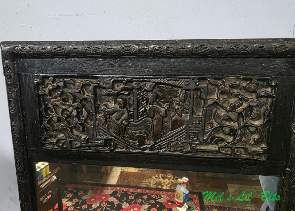 Early 20th Century Antique Lacquered Asian Console Table Mirror with Hand Carved Lacquer Figures Florals