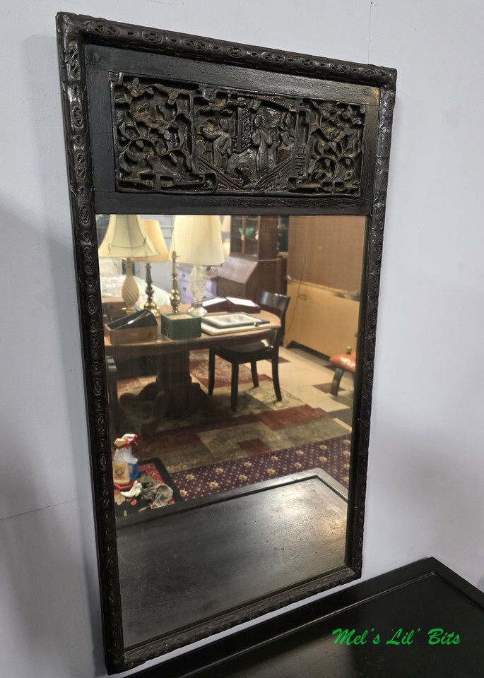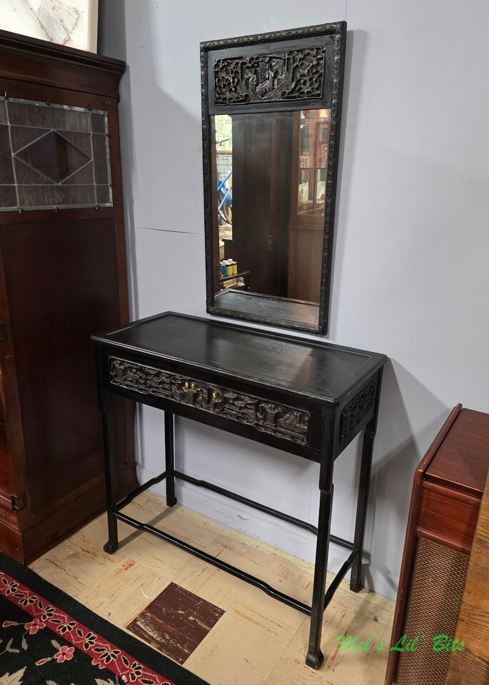 Both are heavily lacquered in black and deeply hand carved with Asian figures and florals. Some of the figures and scenes are colored with Chinese red, greens, and golds. The carvings are in panels on the front and ends of the table and the top of the mirror. The mirror also has a gorgeous carved edge around the complete frame.