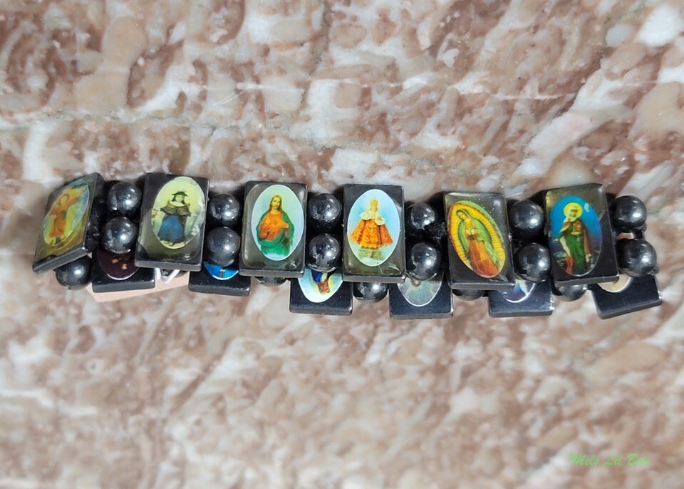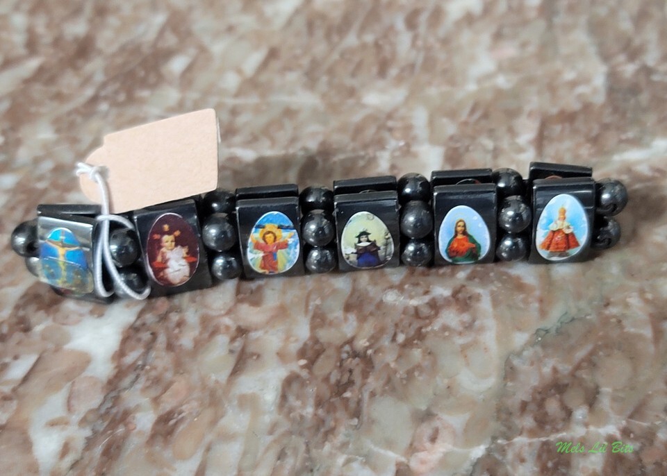 Hematite Stretch Bracelet w/Christian Religious Paintings on Individual Plaques