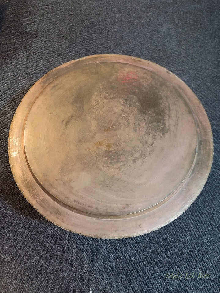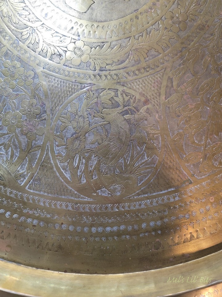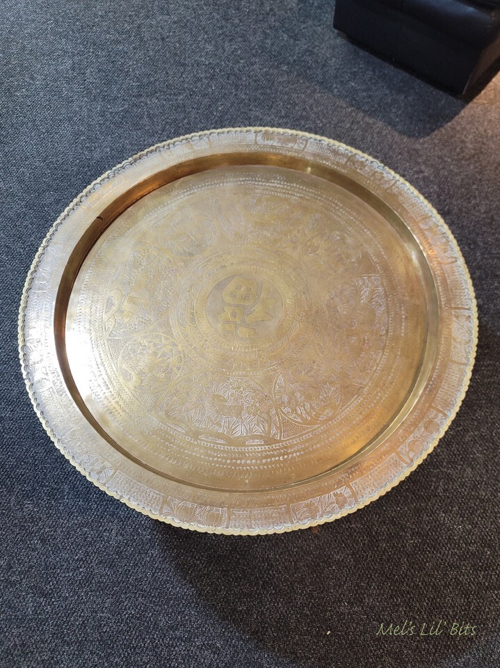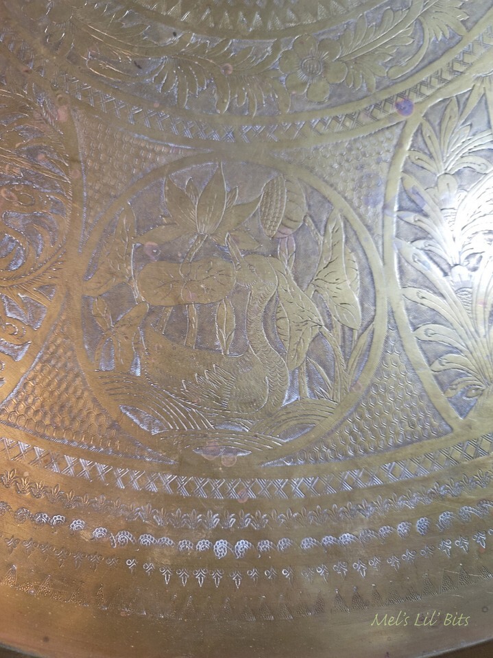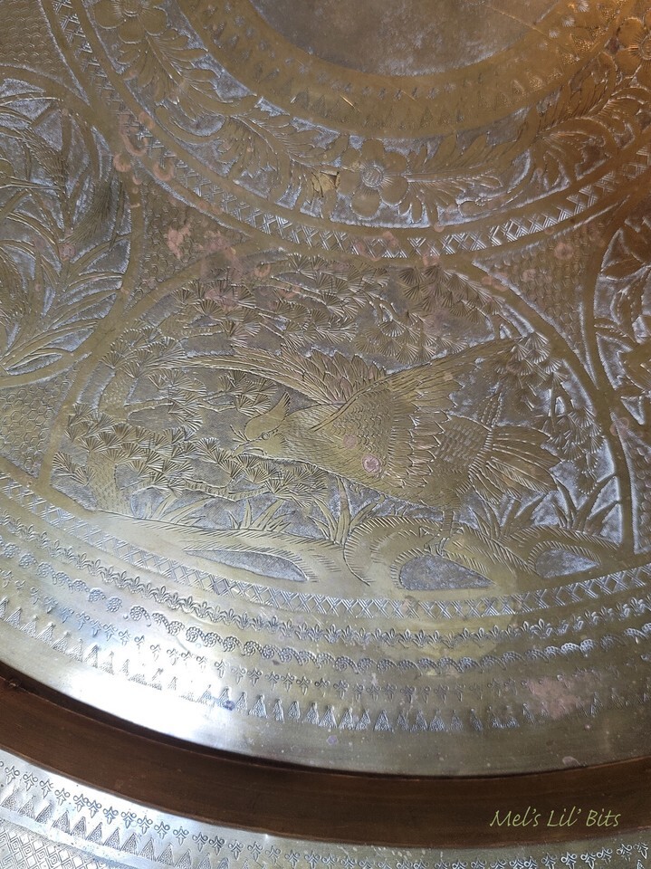 It features a large hammered/detailed brass tray top depicting a menagerie of animals along with a variety of flowers as well as a center insignia with fantastic scroll-like work on the edges.