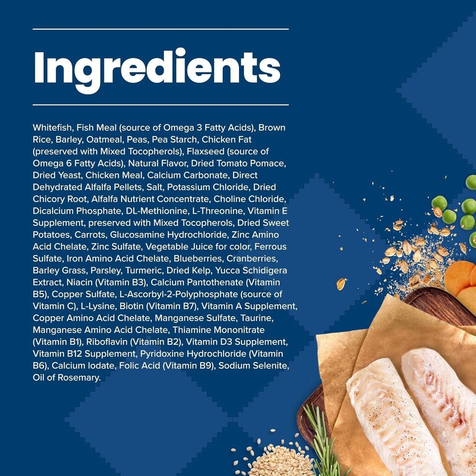Real Fish First: Blue Buffalo's premium dog food features high-quality deboned whitefish as the primary ingredient, combined with brown rice, cranberries, and vegetables for a balanced diet. It provides high-quality protein to support strong muscles.