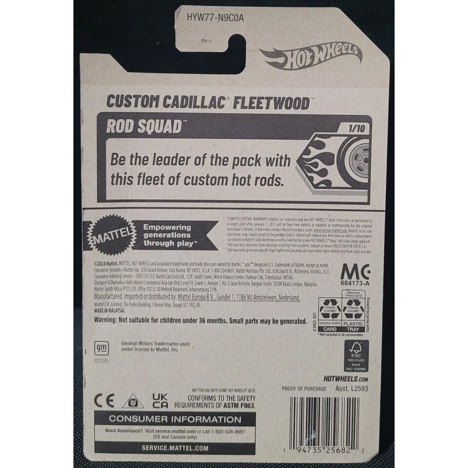 The product is a Hot Wheels Custom Cadillac Fleetwood diecast car in green color, part of the Rod Squad series. It is in 1:64 scale and is labeled as the 2025 release, model 24 out of 250. The car is unopened in its original box and is designed for children and collectors aged 3 years and up. Made by Hot Wheels in Malaysia, this Cadillac is detailed and part of the Cars character family.
