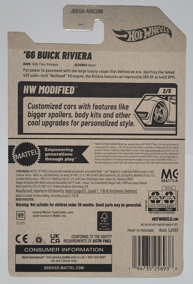 The 2025 Hot Wheels '66 Buick Riviera Black is a 1:64 scale diecast car from the Hot Wheels Modified Rides series. This unopened box vehicle features a black Buick Riviera model, perfect for boys and girls aged 3 years and up. With its detailed design and high-quality construction, this collectible toy car is sure to be a hit among car enthusiasts of all ages. Made in Malaysia by Hot Wheels, this 2025 model is a great addition to any diecast vehicle collection.
