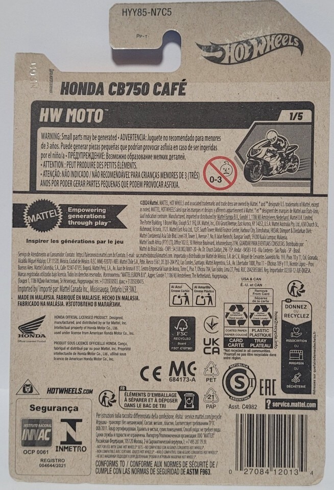The 2025 Hot Wheels Honda CB750 Cafe Gold 150/250 is a diecast motorcycle model from the HW Moto Series. It features a 1:64 scale and comes in an unopened box, making it a collectible item for both boys and girls aged 3 and up. With its detailed design and gold color, this Hot Wheels motorcycle is a must-have for any diecast and toy vehicle enthusiast. The model is of contemporary manufacture and originates from Malaysia, showcasing the quality craftsmanship and attention to detail that Hot Wheels is known for.