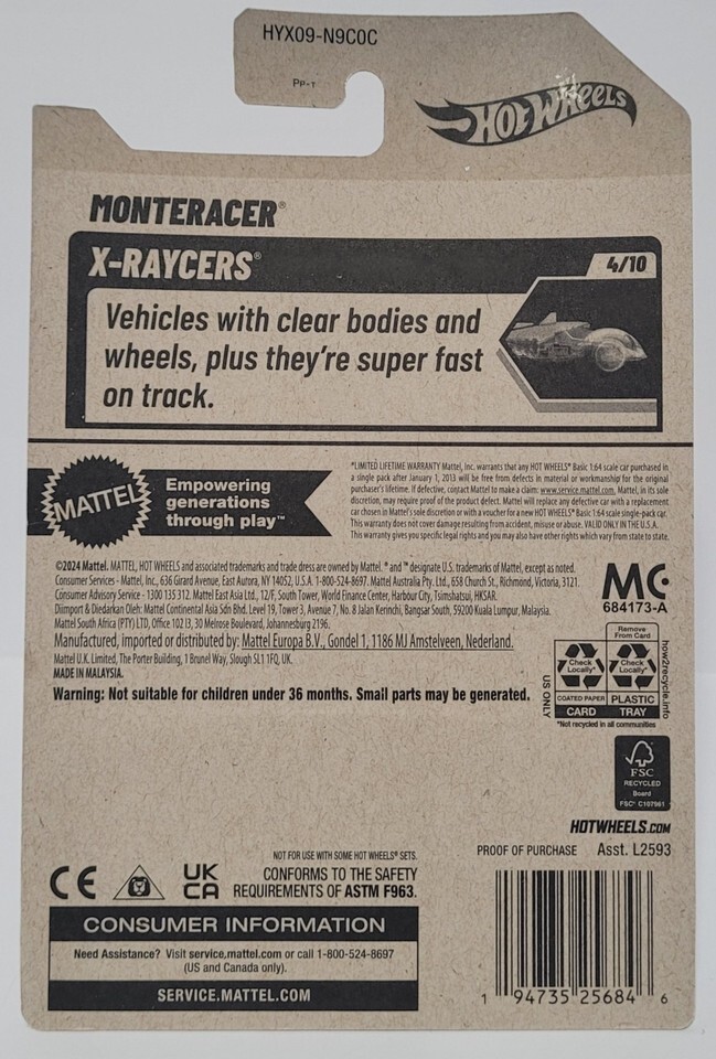The 2025 Hot Wheels Monteracer Clear Violet 63/250 is a diecast toy vehicle featuring a roadster with an F1 inspired fin in a 1:64 scale. Designed by Kevin Cao, this model is part of the X-Raycers series, perfect for boys and girls aged 3 and up. The unopened box makes it a collectible item for fans of contemporary Hot Wheels vehicles, manufactured in Malaysia in 2024. With its unique design and clear violet color, this toy is sure to be a sought-after addition to any diecast collection.