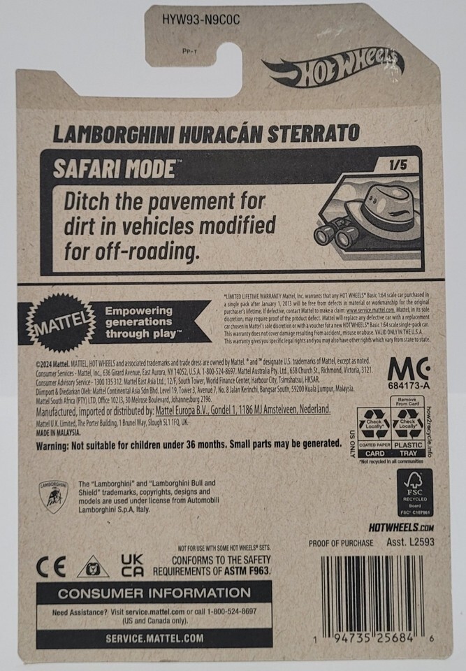 The 2025 Hot Wheels Safari Mode White 1/5 Lamborghini Huracan Sterrato 41/250 is a highly detailed diecast model car in 1:64 scale, perfect for car enthusiasts of all ages. This collectible toy vehicle features the iconic Lamborghini brand and a sleek white color, making it a popular choice among boys and girls alike. With its unopened box and origin in Malaysia, this Hot Wheels car is a must-have addition to any collection, especially for fans of contemporary manufactured vehicles.