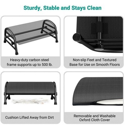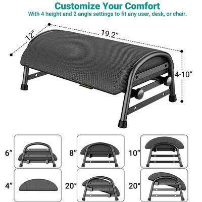 Adjustable Under Desk Foot Rest Ergonomic Memory Foam Adjustable 4?10" height and 2 angle positions. Memory foam cushion with ergonomic contour for foot support. Sturdy carbon steel frame, 500 lb capacity. Removable, washable cover; versatile as a foot rest, knee rest, or compact stool. Specifications Dimensions (LxWxH): 19.2" x 12" x 4?10" H Weight: not disclosed Materials: Alloy steel, memory foam Color options: Black Capacity: Up to 500 lbs Power/battery: None Dimensions Product dimensions: 19.2" L x 12" W x 4?10" H Packaging: not disclosed Care Removable, washable cover; spot-clean foam; keep frame dry. Warranty 1 Yr. Material Alloy Steel, Memory Foam Color Black Product Dimensions 19.2"L x 12"W x 10"H Brand YEASHEIN Size 19.2?L x 12?W x 4-10?H