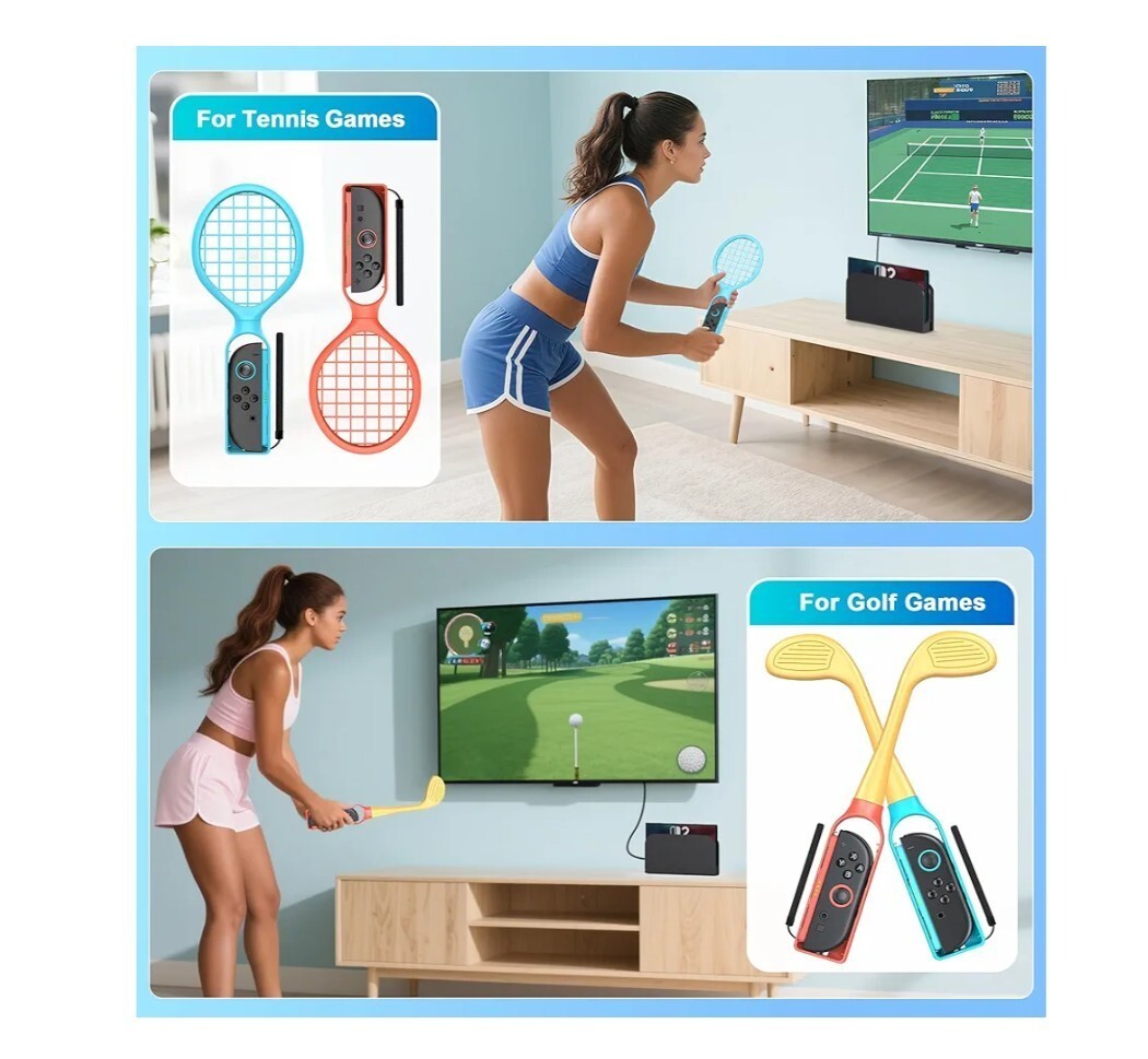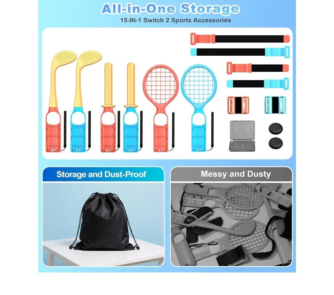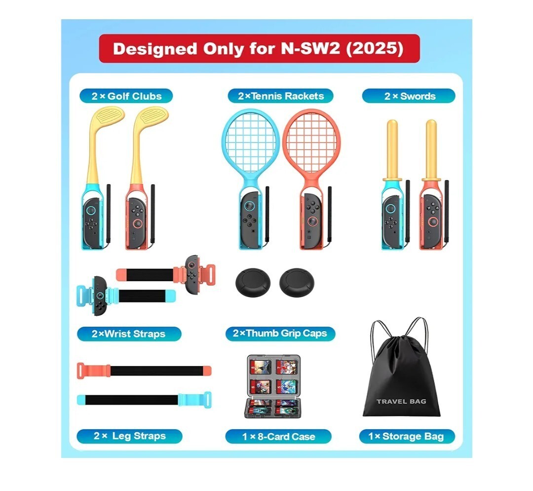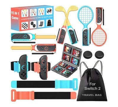Transform your Switch 2 sports gaming experience with this all-in-one 15 piece sports accessory bundle! Complete set includes 2 Golf Clubs, 2 Lightsabers, 2 Leg Straps, 2 Wrist Straps, 2 Thumb Grip Caps, 1 8-Card Case, and 1 Storage Bag ? everything you need for Mario Golf Super Rush, Mario Tennis Ace, Just Dance, Ring Fit Adventure and more motion-controlled games. NOTE: ONLY FOR 2025 SWITCH 2 Gen