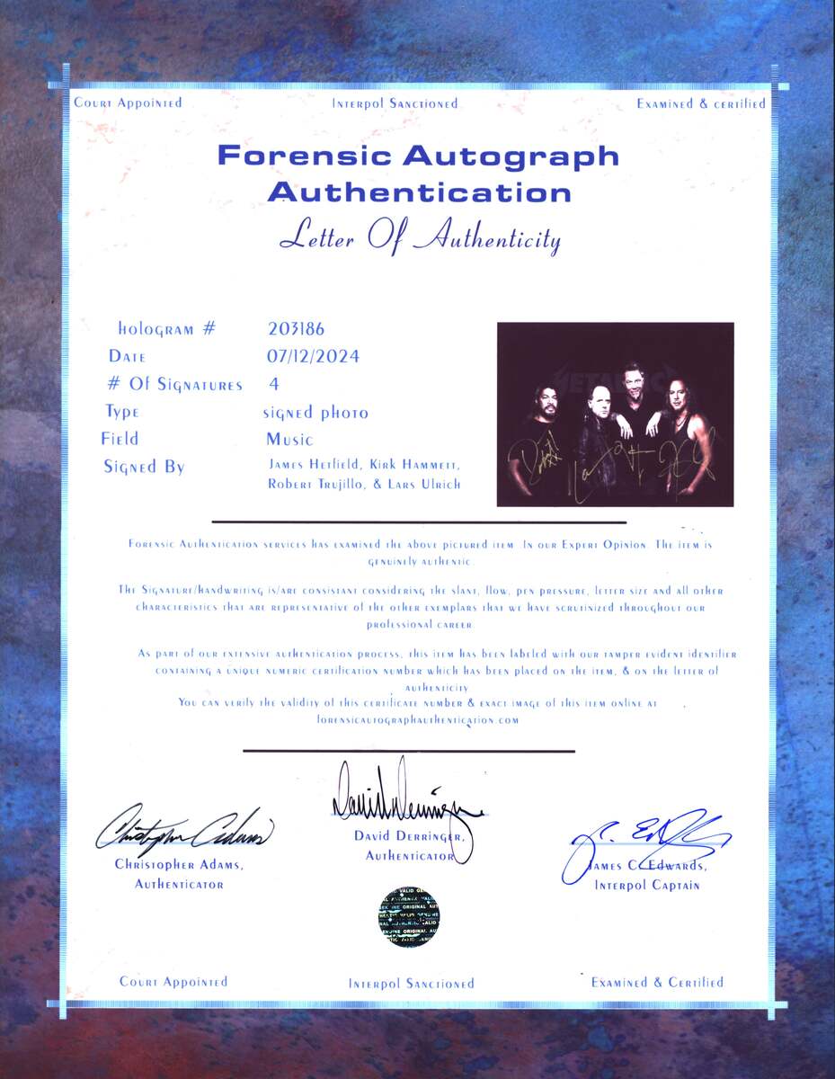 Autographed in person by: James Hetfield, Kirk Hammett, Robert Trujillo, and Lars Ulrich