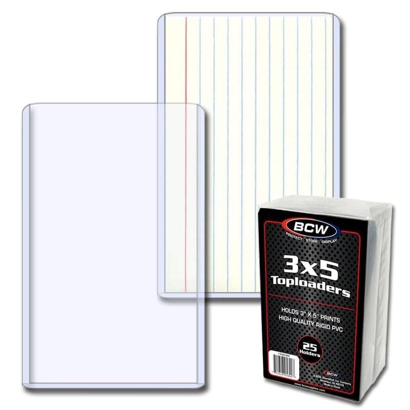 The BCW 3 X 5 top loading holders are designed to hold cards, photos or prints that measure 3x5. The PVC used in the 3x5 toploader as well as other BCW toploaders contain no plasticizers or stearates. Our high quality PVC does not migrate and will not harm your cards, photos or prints, while offering maximum protection and visual appeal.