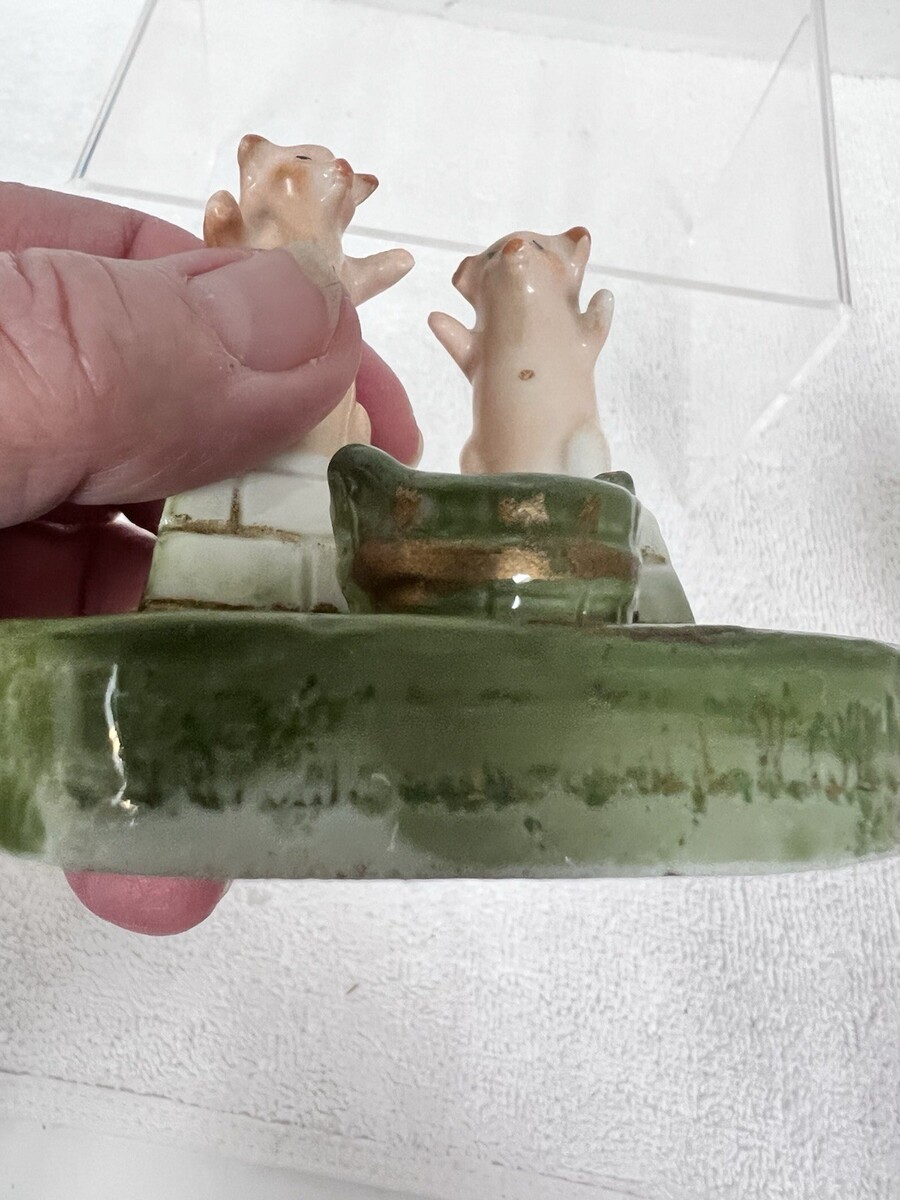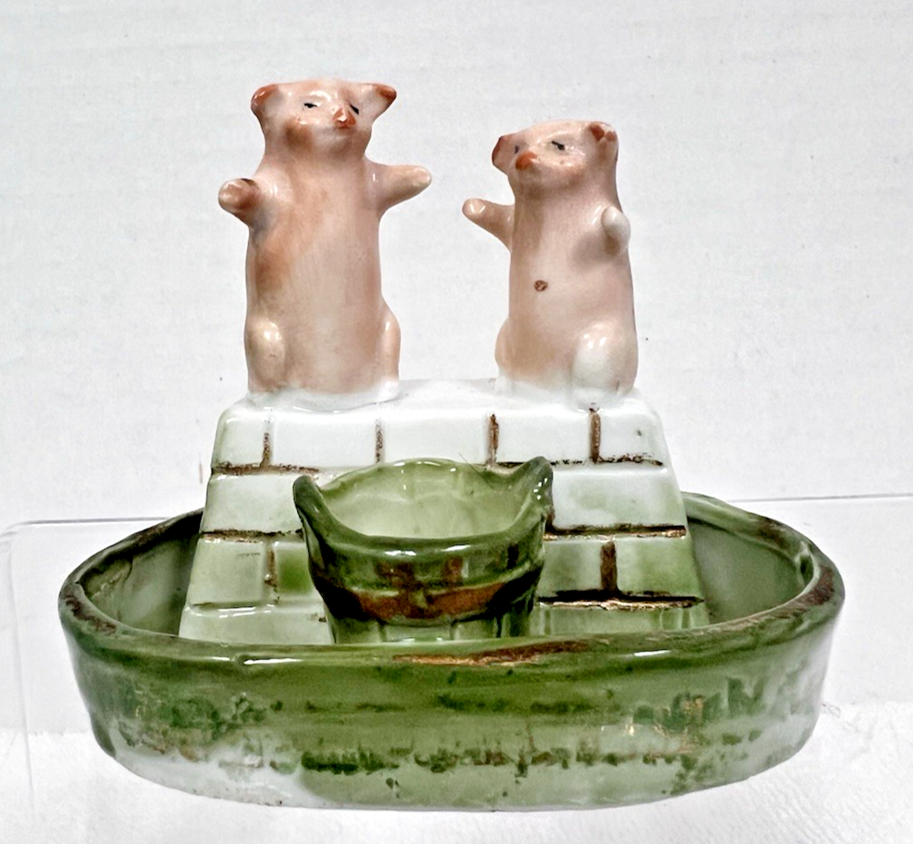 Antique German Pink Pigs Fairing Green Bucket White Wall Dish Toothpick Holder