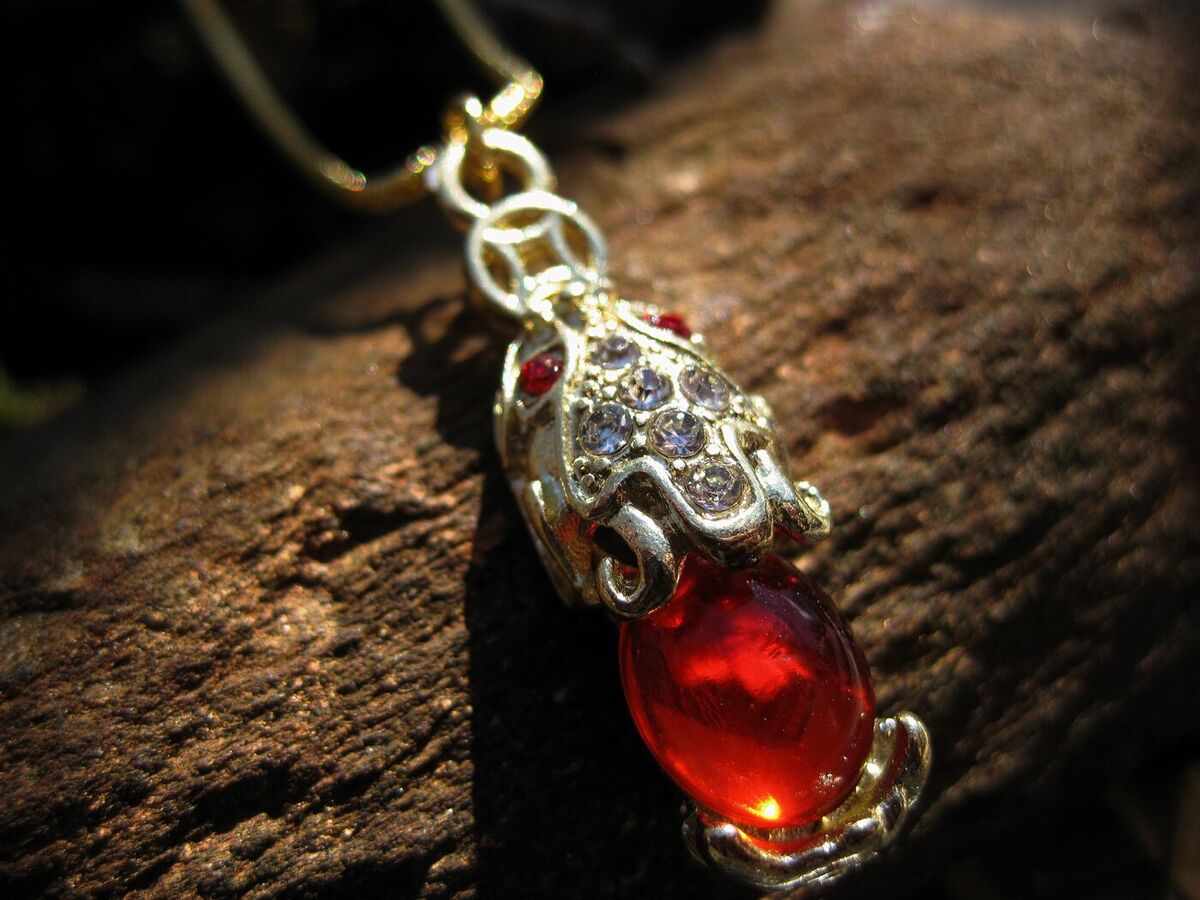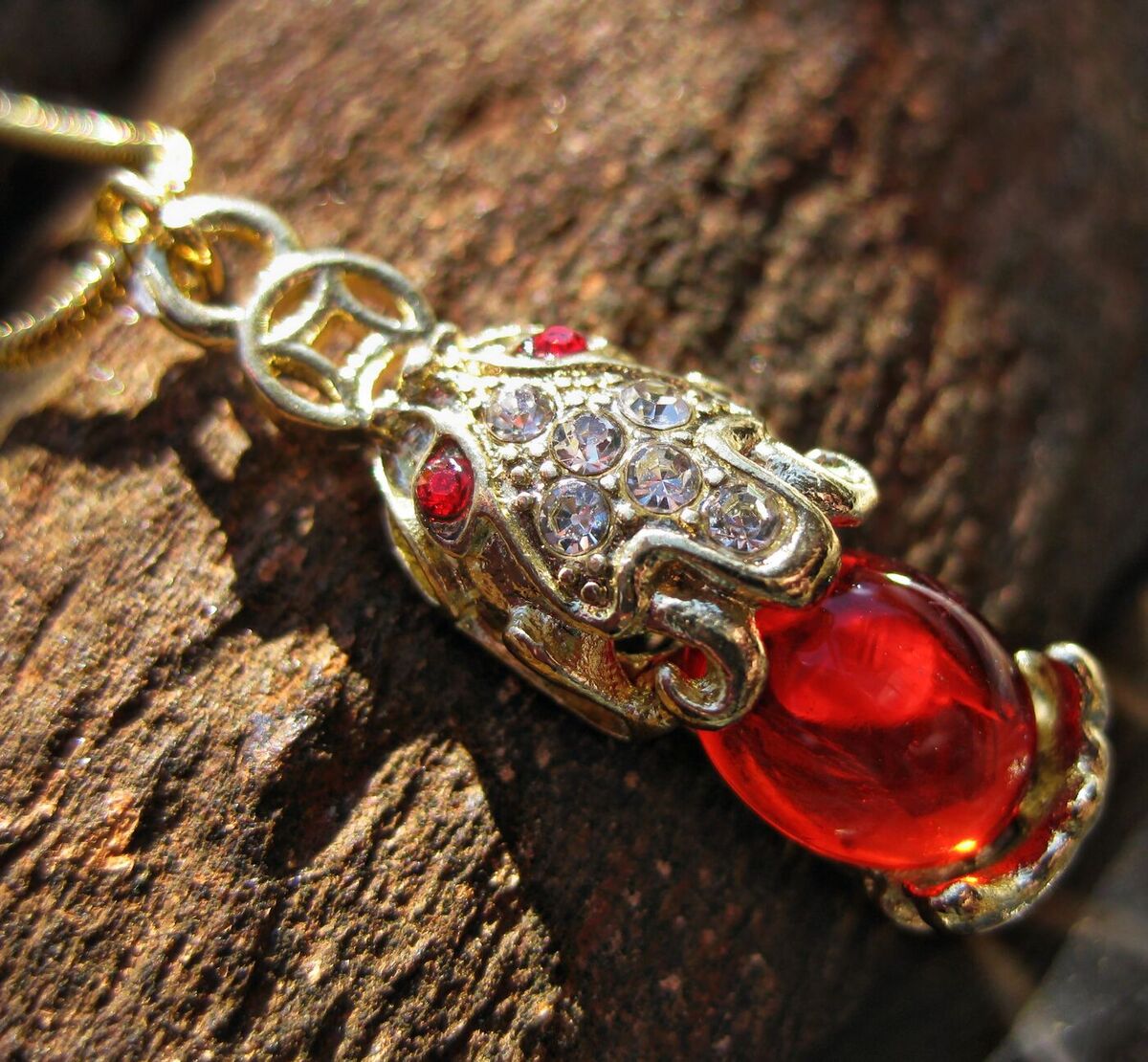 Vessel: As shown. A gold pixu with a red Naga Eye stone in the center . Please note, this is a very small amulet measuring 1 inch long. Pictures are enlarged to show detail.