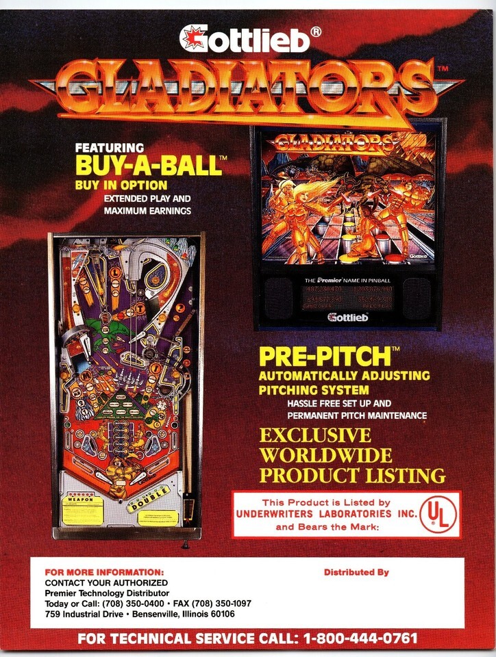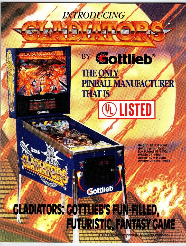 1993 Gottlieb Gladiators Pinball Machine Sales Flyer UL Listed