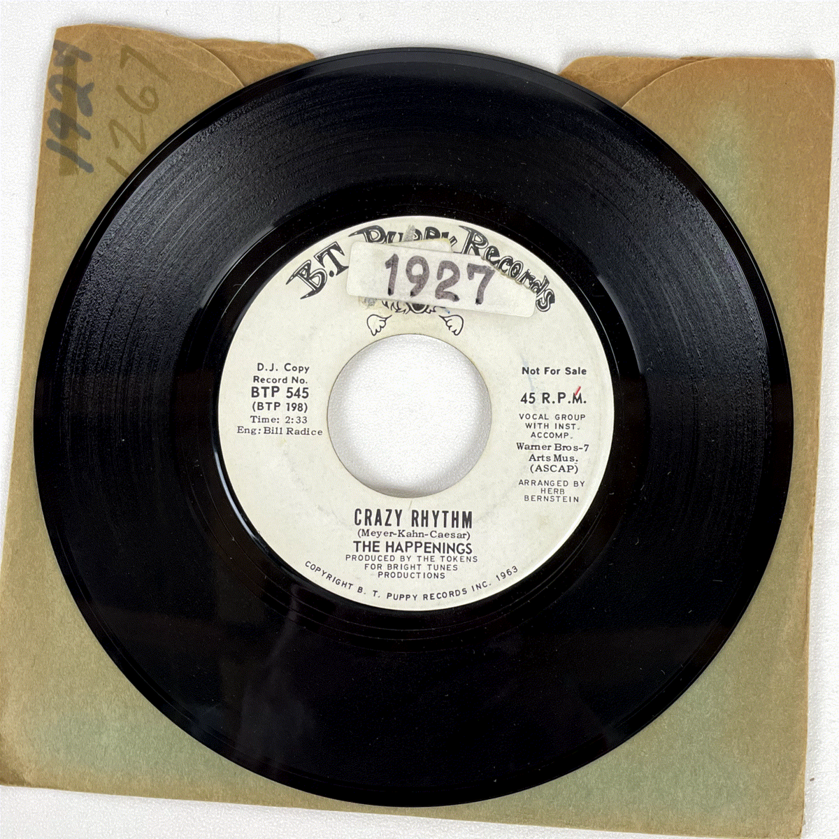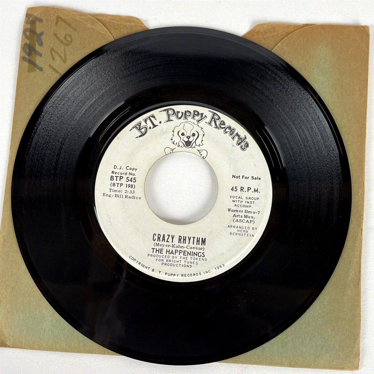 Discover a piece of early 60s pop history with this rare promotional 7-inch single by The Happenings, featuring the track "Crazy Rhythm." Released in 1963 on the B.T. Puppy Records label, this particular pressing is designated as a "D.J. Copy" and explicitly marked "Not For Sale," making it a highly collectible item for enthusiasts and collectors of vintage vinyl.