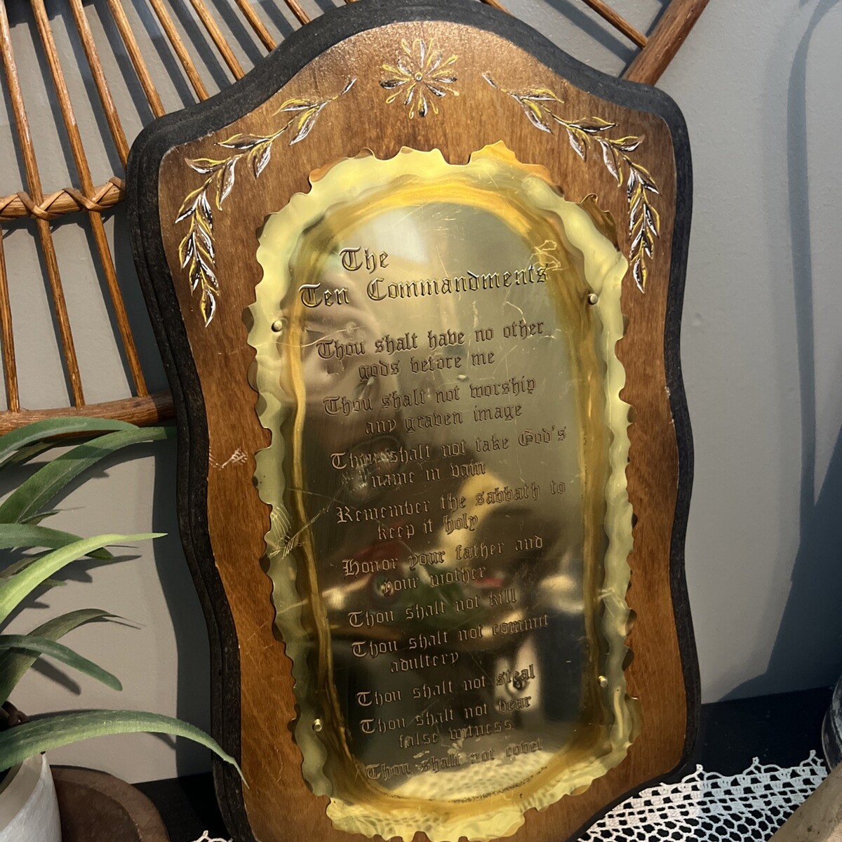 VINTAGE HOME INTERIORS THE TEN COMMANDMENTS WOOD & BRASS WALL PLAQUE 10” X 18”