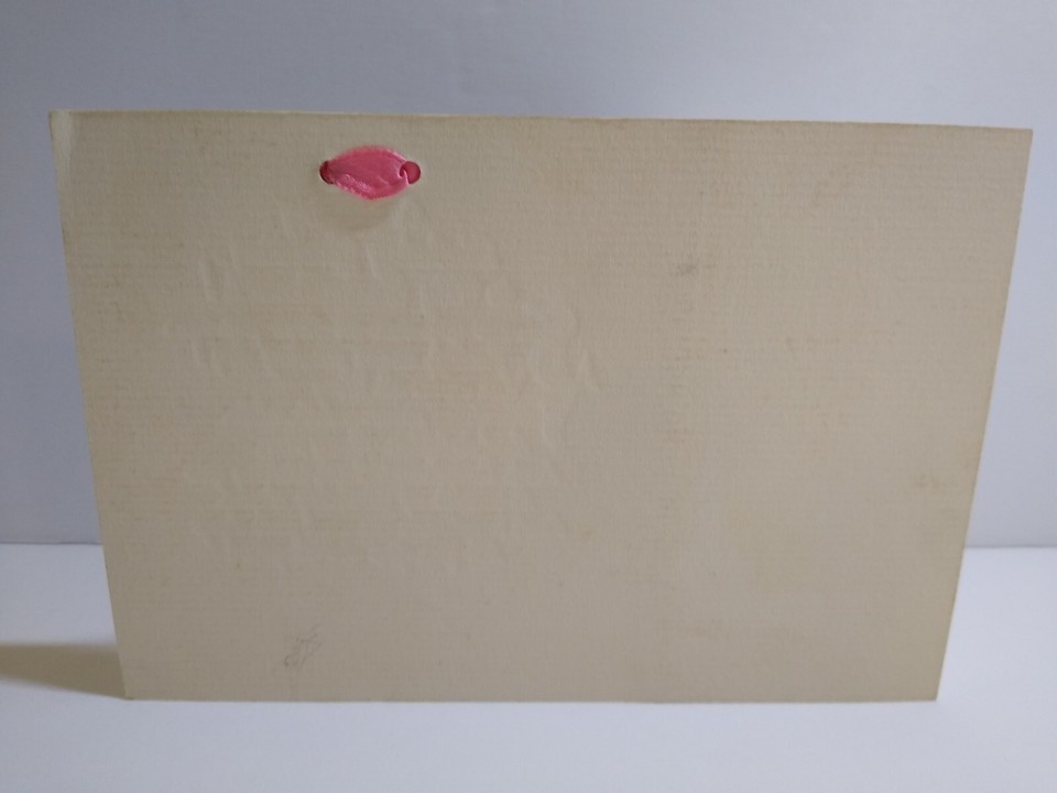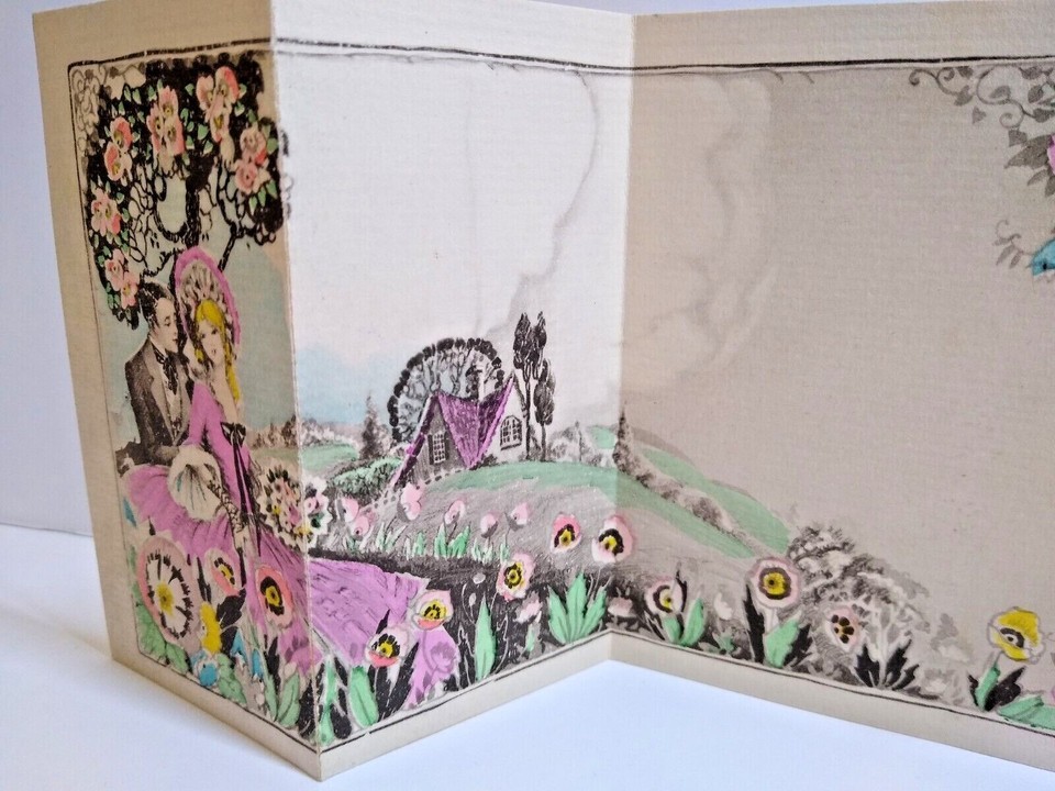 Vintage early greeting card. Foldout design. 1931 and name written on panel. Has pink ribbon attached. Has corner wear, Crisp clean graphics. Opens up to Size is 9.75" x 4". Stock#gc41.