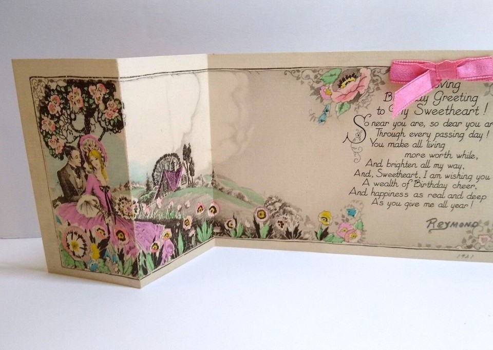 Vintage 1931 Birthday Greeting Card Couple In Flower Covered Meadows Pink Ribbon