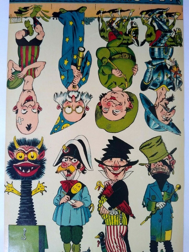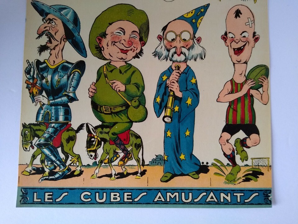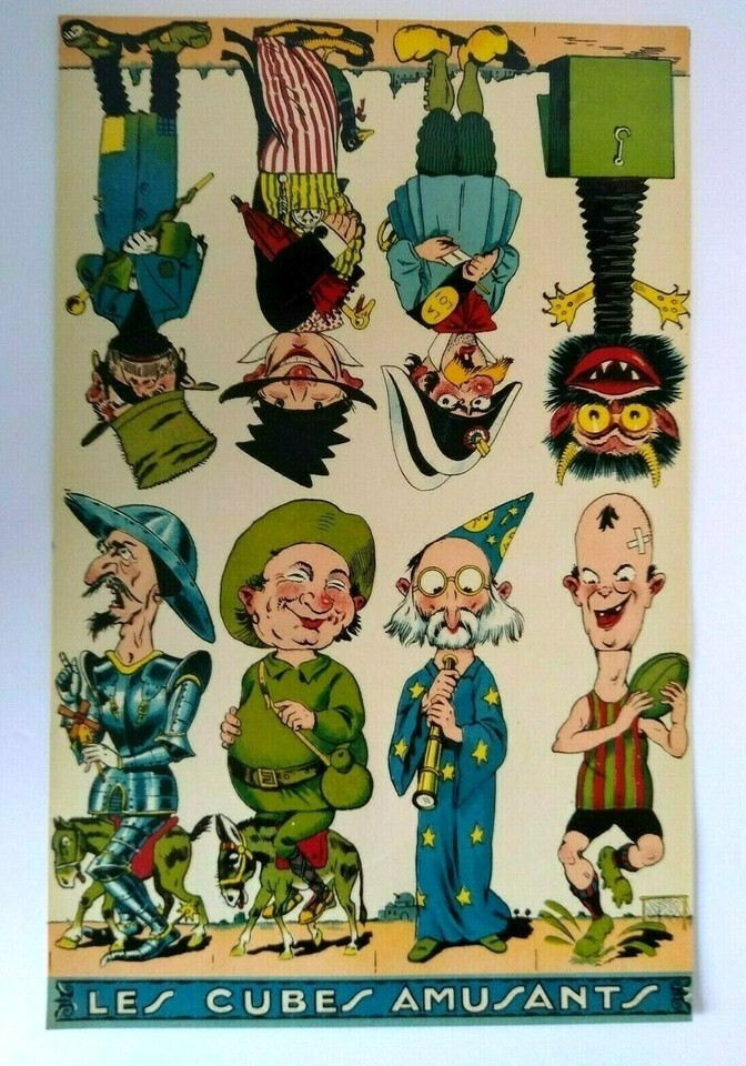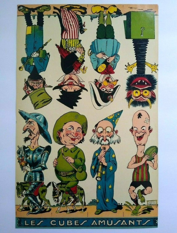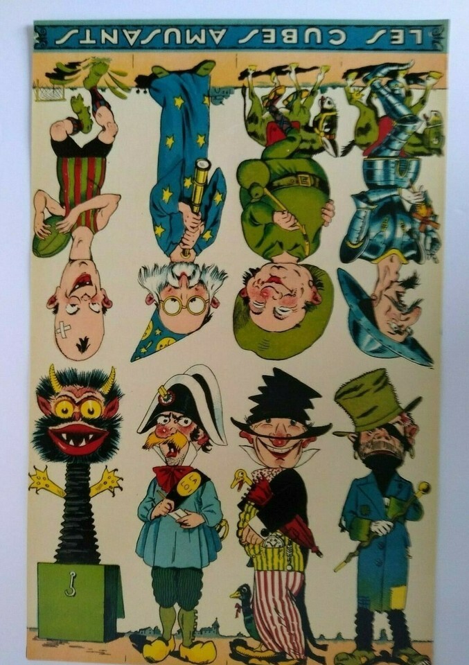 Original circa 1920's original paper artwork that was to be used to make game cube wood block twist toys where the faces and bodies would change. Made in France by Les Cubes Amusants. Single page one sided paper art print sheet that shows 8 different comical characters. The sheet shows 4 right side up and 4 upside down. Light age wear only. Size is 7.5 x 11.85.