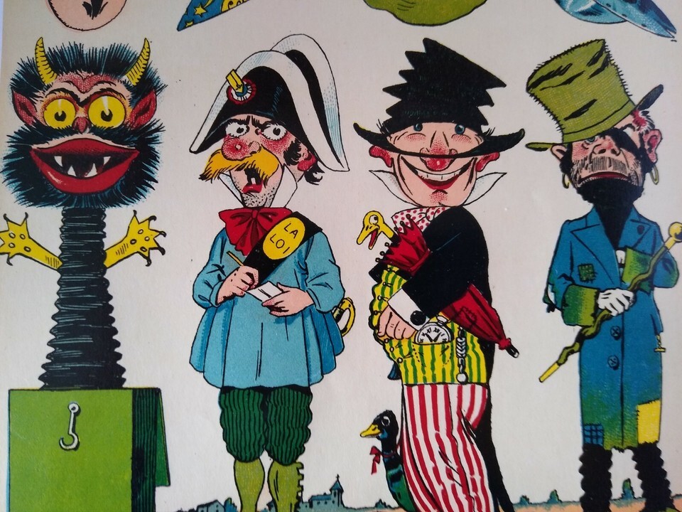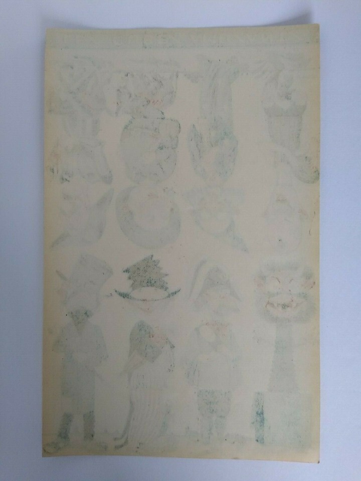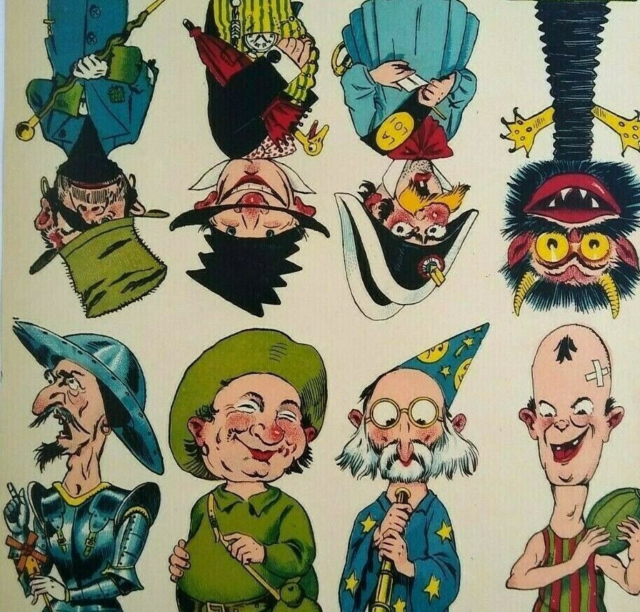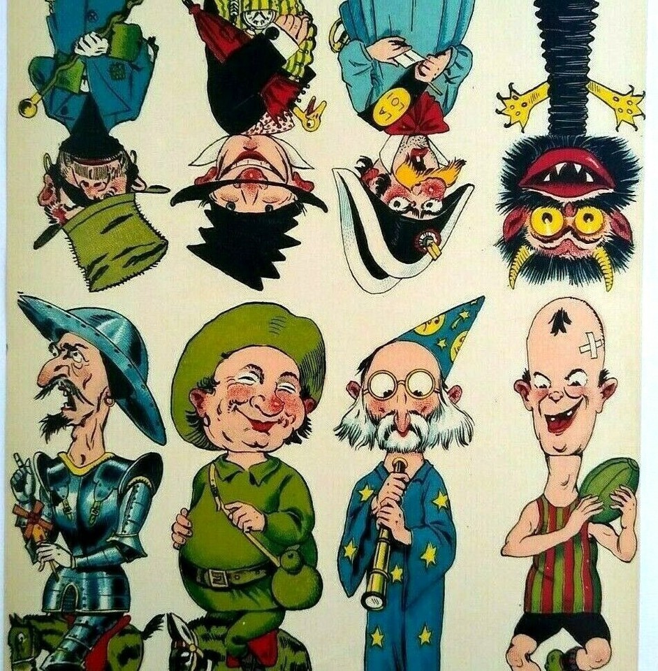 Original circa 1920's original paper artwork that was to be used to make game cube wood block twist toys where the faces and bodies would change. Made in France by Les Cubes Amusants. Single page one sided paper art print sheet that shows 8 different comical characters. The sheet shows 4 right side up and 4 upside down. Light age wear only. Size is 7.5 x 11.85.