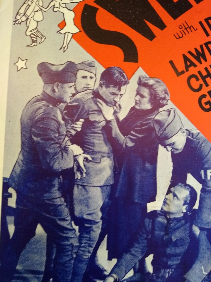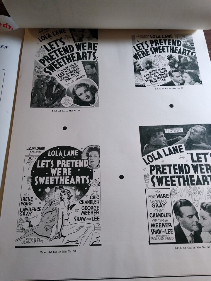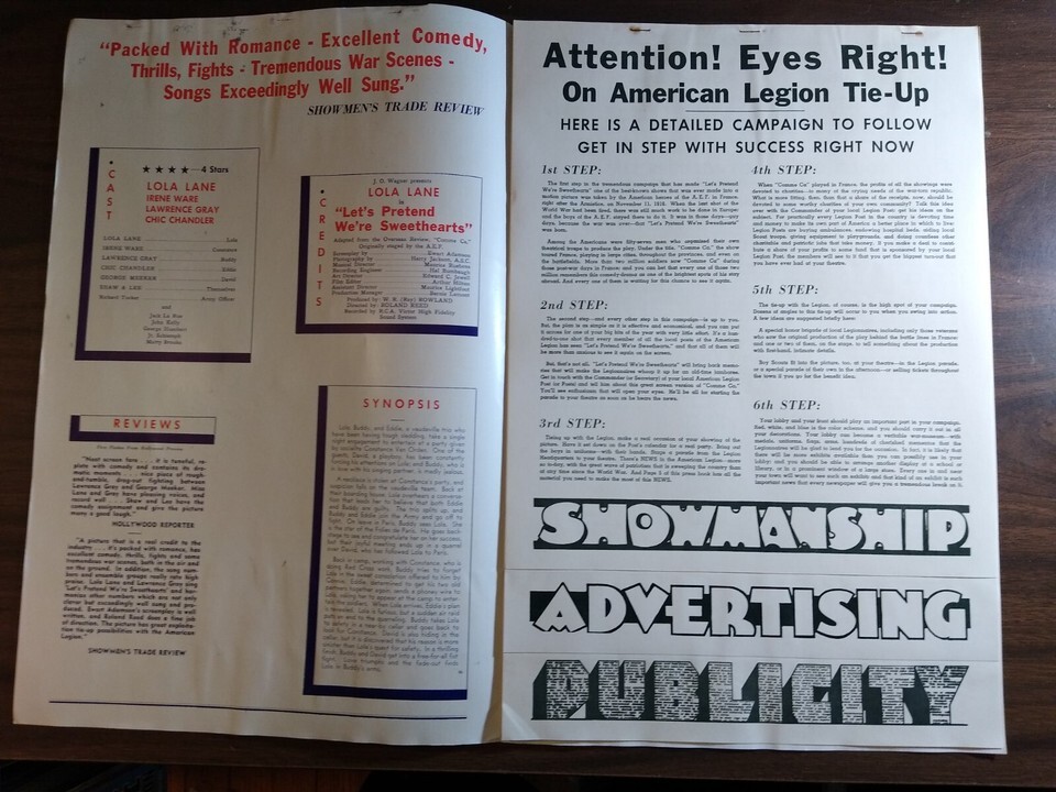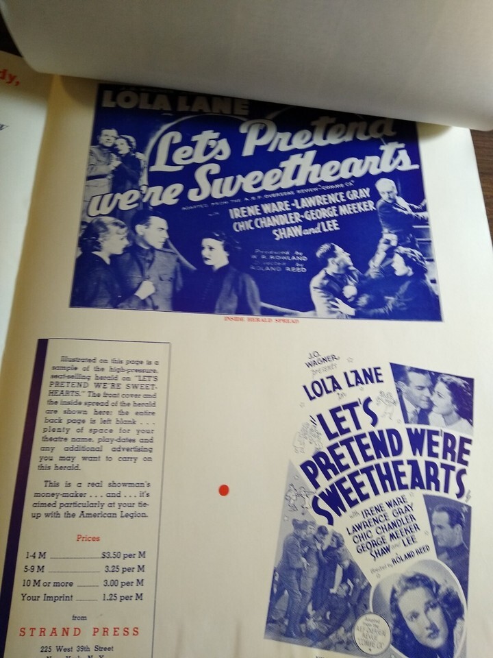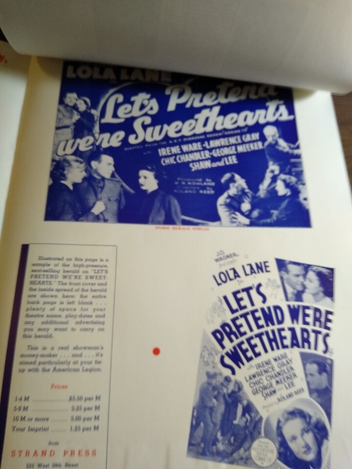 Huge 18" x 12" oversized vintage eight page publicity brochure for the 1936 Lola Lane Let's Pretend We're Sweethearts movie. Illustrations and propaganda on each page. Has some rust spots by the staples and corner edge creases.