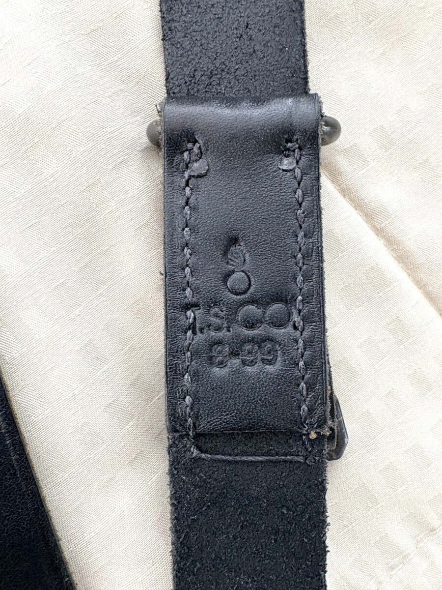 Turner Saddlery (T.S. Co.) black leather sling, with Steyr Mannlicher logo, and U.S. Ordnance Logo (Flaming Bomb) 8-99 in excellent used condition.