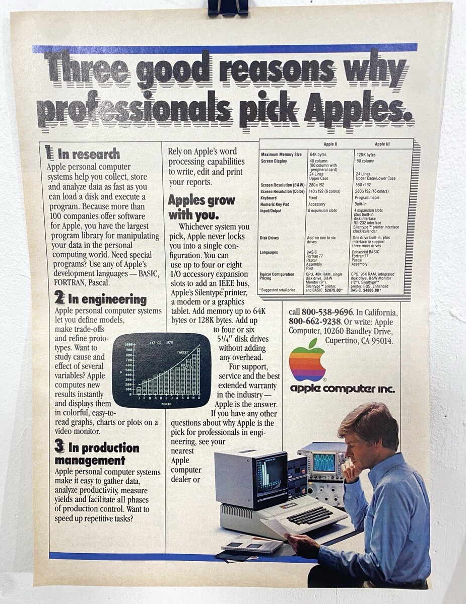 The 1980 Apple II and III Computers Ad features three good reasons for the model's popularity. These vintage computers, manufactured between 1980-89, provided users with practical and powerful tools for computing and productivity. With their sleek design and innovative features, the Apple II and III computers quickly gained popularity among consumers and businesses. The ad highlights the advantages of these early models, making it a valuable collectible item for enthusiasts of vintage technology.