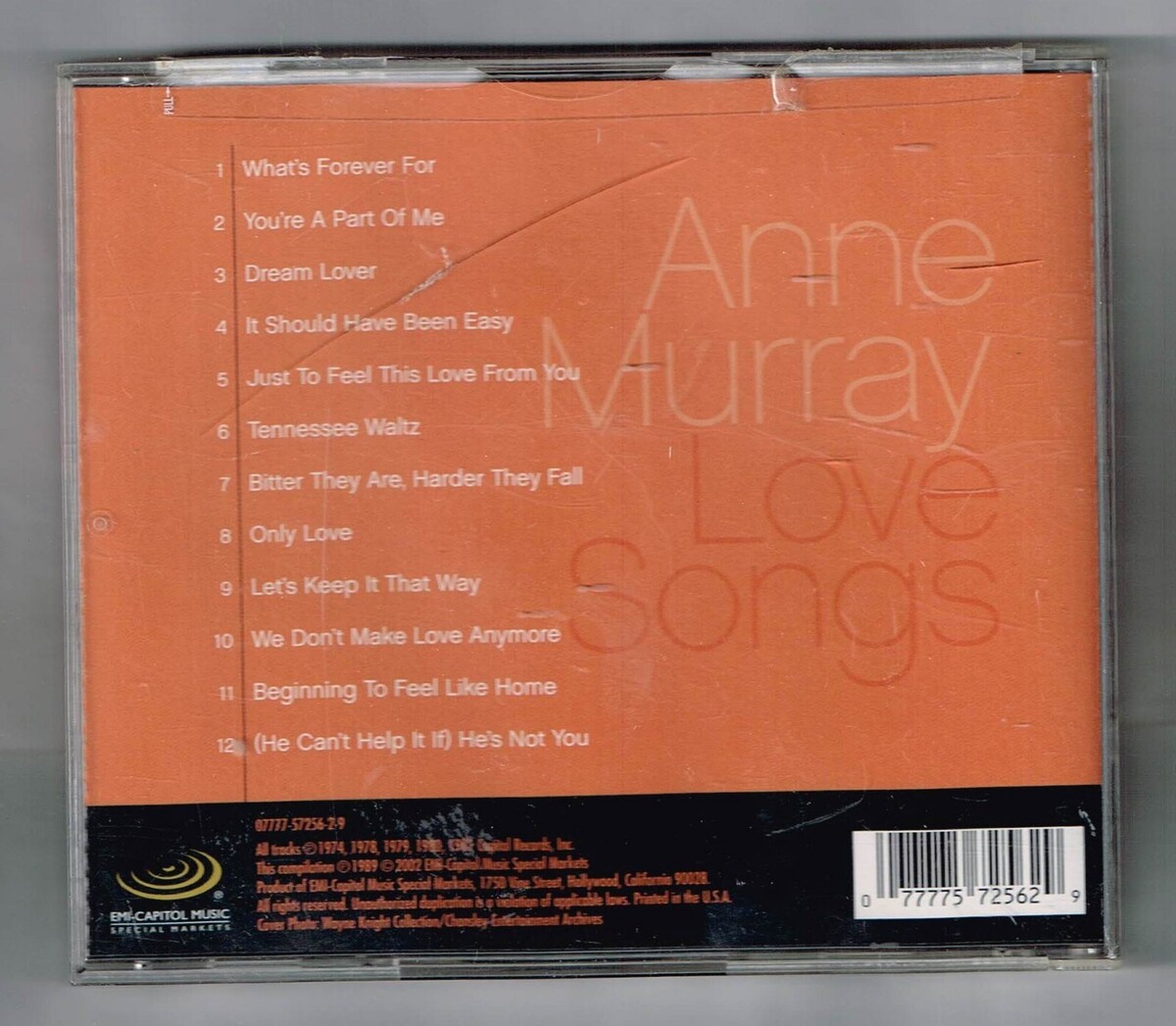 For Sale is a Love Songs by Anne Murray (Music CD, 1995). In good USED condition comes as pictured. Please ask Any and All Questions prior to purchasing. Fast Same or Next day shipping with Free Delivery Confirmation within the U.S. Payment Due within 7 days of purchase (if you need more time please let us know In advance) we love to combine shipping is always a Yes and Most of the time Additional Items Ship for free.