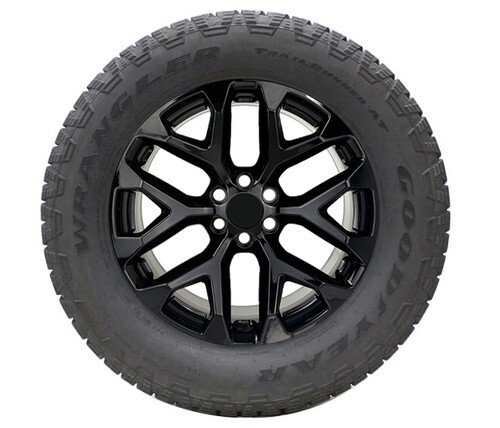 New Set Of Four GM Style Replica 20" Gloss Black Snowflake Wheels With Takeoff Goodyear Trailrunner AT 275/60R20 Tires including new TPMS sensors