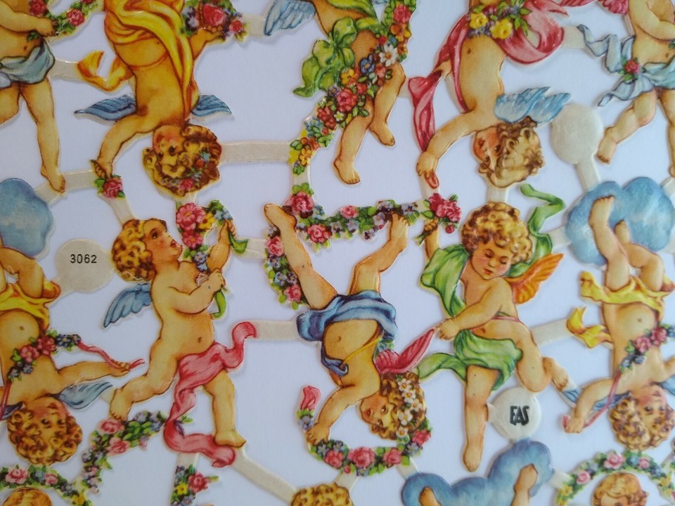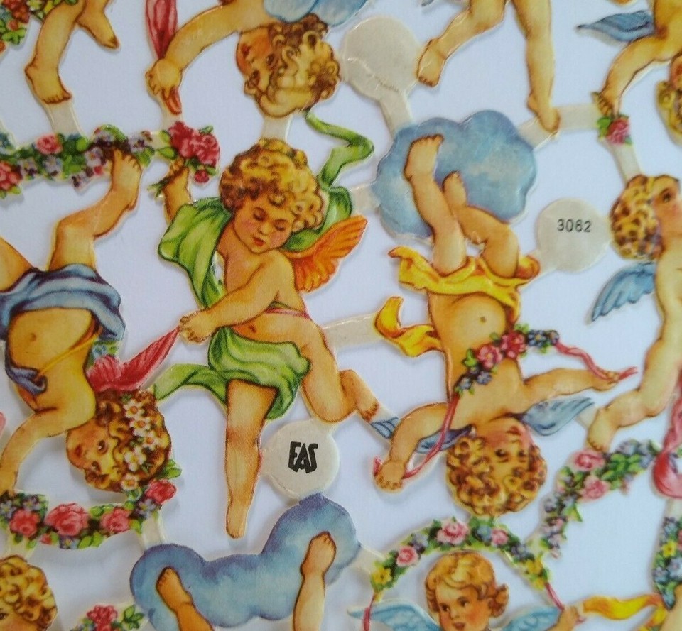 Original vintage circa 1930's era die-cut Cherub Angels. These are attached and marked EAS and items number 3062. Entire sheet is 9" x 6.5". Cherubs are about 2" size.
