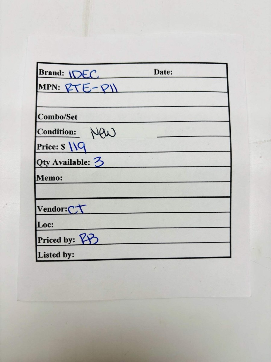 IDEC RTE-P11 Relay Socket Base New Original Box Not Included This listing includes a quantity of 3 Units. Only one unit is shown in the photos; the other 2 are not pictured and may differ in external appearance, but all units are in the same condition. IDEC RTE-P11 is a plug-in relay socket base designed to hold and connect small control relays in electrical control panels. It provides a secure mounting point and an easy wiring interface for compatible IDEC plug-in relays, allowing the relay?s pins to be inserted without soldering. The socket typically has screw-type terminal connections for field wiring and is used in automation, control, and signaling circuits. It helps simplify installation and replacement of relays in industrial equipment, machinery controls, and building automation systems. Listed by: Renee (Sales Team) ?character consist of what you do on the third and fourth tries? James Michener (A positive moment brought to you by Help Resale) About Us Welcome to Help Resale, your go-to consignment shop where value meets quality. At Help Resale, we're dedicated to providing you with an exceptional shopping experience, whether you're looking to find the best deals or consign your items. Need to buy a product, but don't see it in our store? Please feel free to reach out to us and we will help you find it! Help Resale 7200 Fair Oaks Blvd Suite 120 Carmichael CA 95608 Business Hours: Monday-Friday: 9:00 am to 5:00 pm (PST) All product and company names are trademarks TM or registered trademarks of their respective holders. Use of them does not imply any affiliation with or endorsement by them.