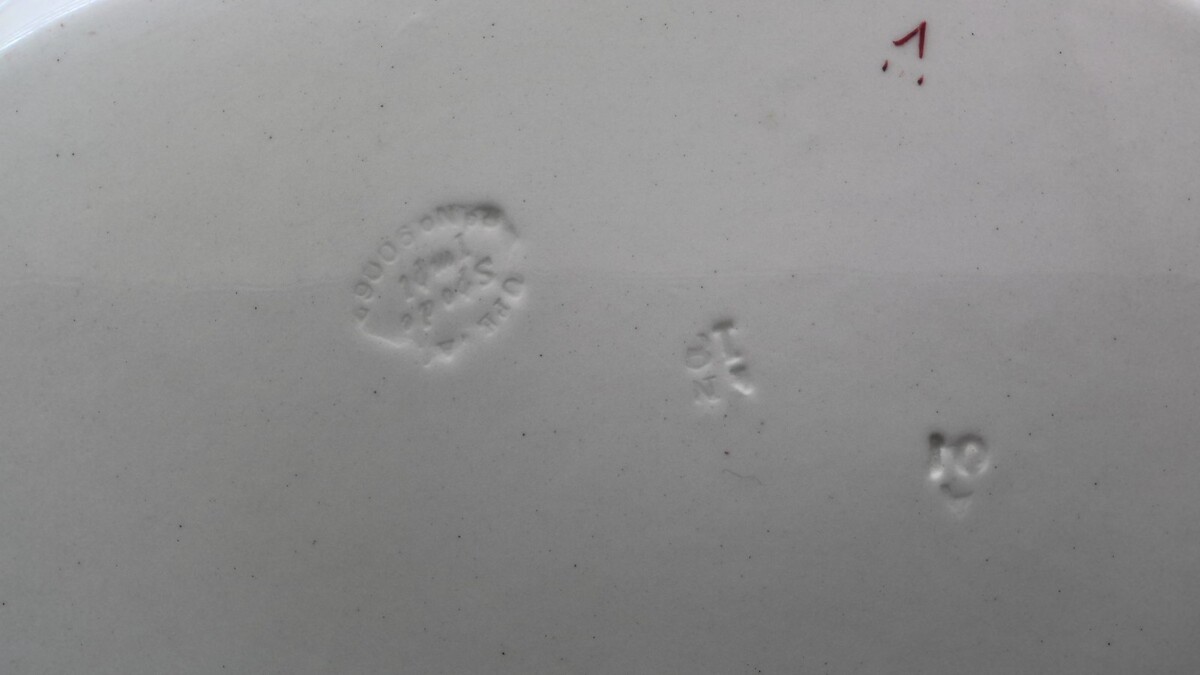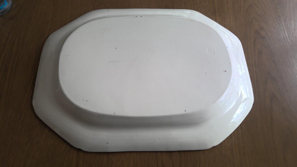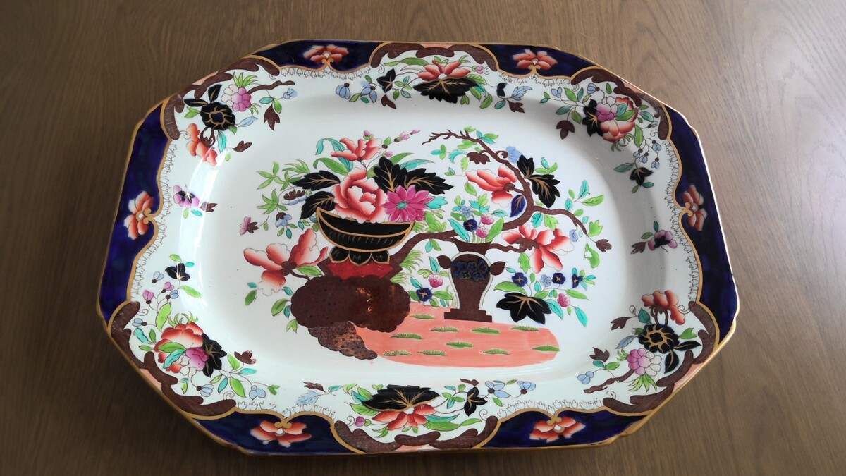 Georgeous colorful antique spode serving tray with markings on back. It is a large serving tray measuring 19.25" long x 14.5" wide x 1.75" tall. Geat condition.