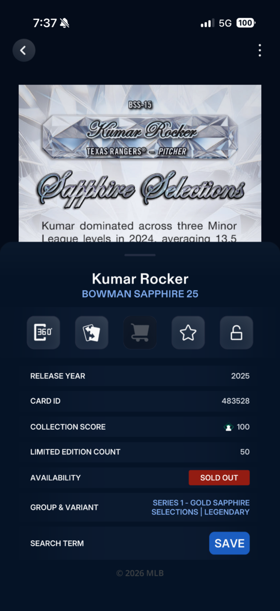 [DIGITAL CARD] TOPPS BUNT Kumar Rocker - Gold Sapphire Selections /50 Legendary
