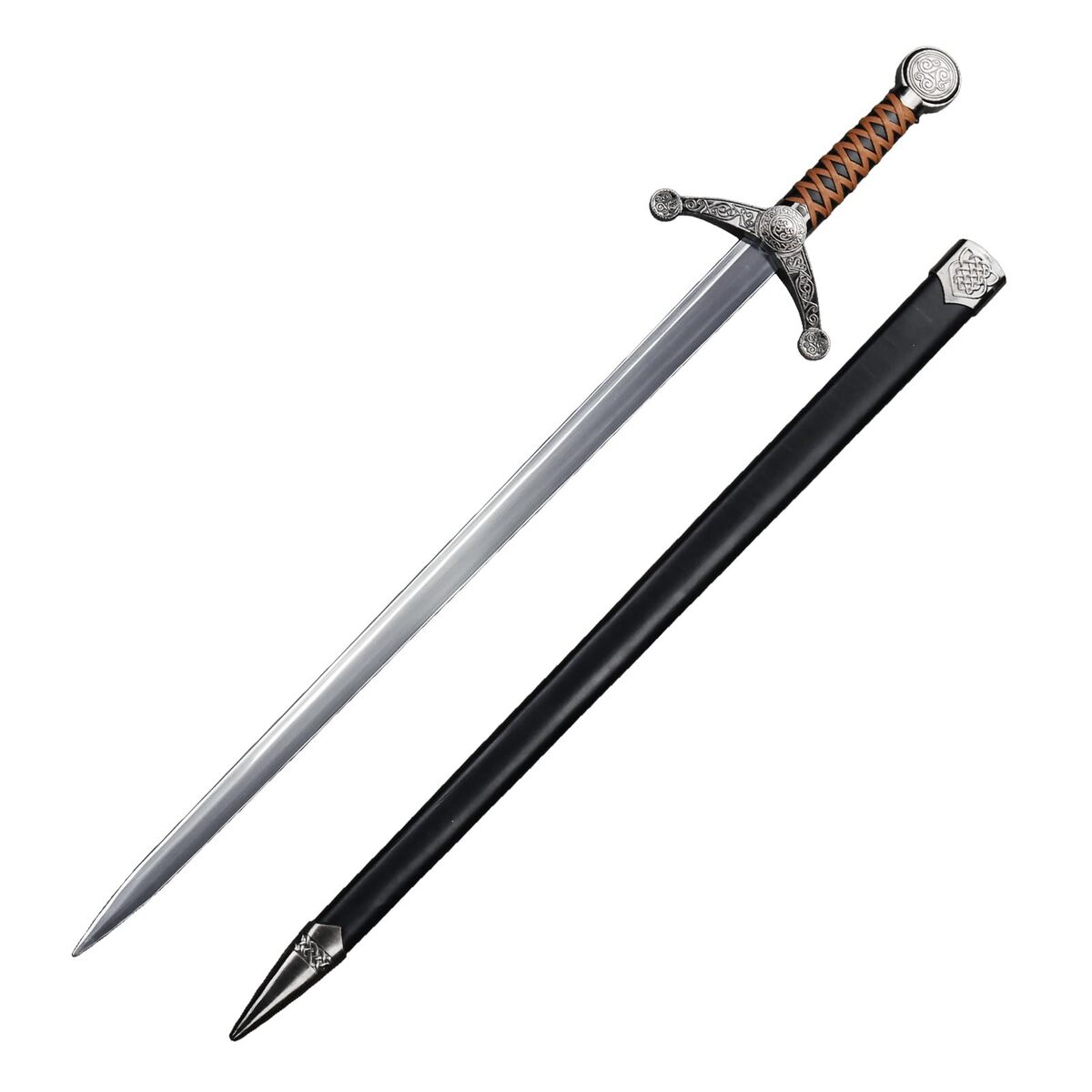 Product description: You are a proud Roman Legionnaire, marching northward from Londinium, laughing and joking with your fellow infantry about routing the Gaul barbarians. The silent woods gather around on all sides as the tramping rhythm of your footfalls continue their advance, until, with a burst of noise, the trees themselves seem to speak Celtic, and you and your Legion find yourselves beset by a storm of swords and cries. This sword speaks to that time in the ancient past, when the mighty tree-worshipping Celtic peoples of the British Isles fought valiantly, but in vain, against the heavy hand of the Romans. Take up this sword, find your Boudicca, and charge into battle with nothing but war paint and rebellious spirit! [Dimensions] Overall Length: 40.5? Blade Length: 28.5? Hilt Length: 5.5? Weight: 3 lb [Blade] While not made from Noric steel, the stainless steel blade is probably much prettier and more suitable for decor [Scabbard] Constructed of black pleather and wood, the scabbard is as decorative as it is protective [Sons of Boudicca] The twist, intertwined designs throughout the scabbard and hilt hearken back to a time of ancient druidic mysticism [Quality] All of our products are made of the finest materials, and are packaged securely in our own warehouse