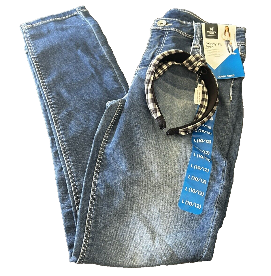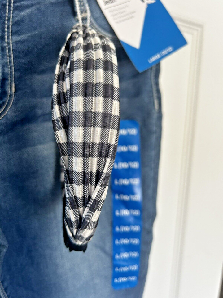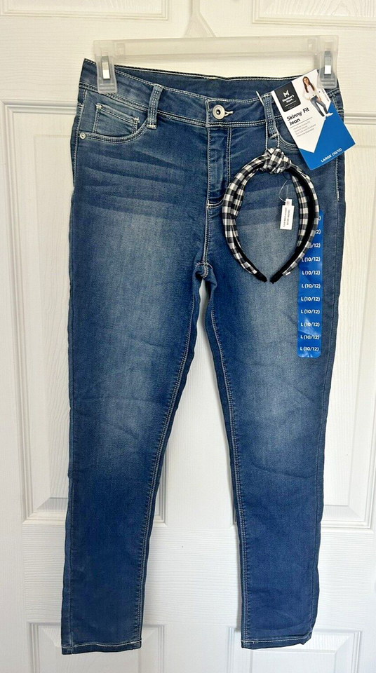 Girls Skinny Fit Jean Sz L 10/12 Denim & Black White Checked Headband 26W X 22L