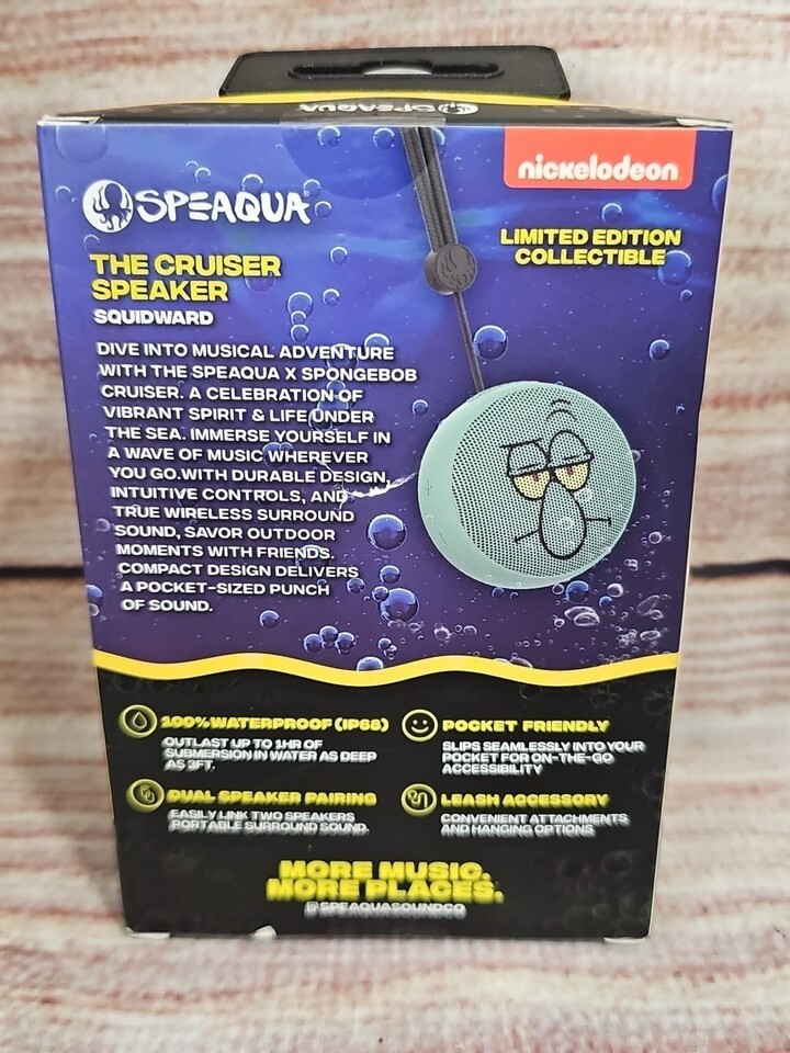 The SpongeBob SquarePants 100% Waterproof Shower Pool Bluetooth Speaker Squidward is a portable speaker system with a 2.0 channel system configuration, made of yellow plastic material. It features Bluetooth connectivity and is compatible with universal audio inputs, perfect for use in showers, pools, or any outdoor setting. The speaker is compact, with dimensions of 2 inches in height and weighs 1 pound, making it easy to transport and use on the go. Its unique design, with the SpongeBob SquarePants theme, adds a fun and colorful touch to any space. Made by the brand Speaqua, this waterproof speaker is a great addition to any audio setup.