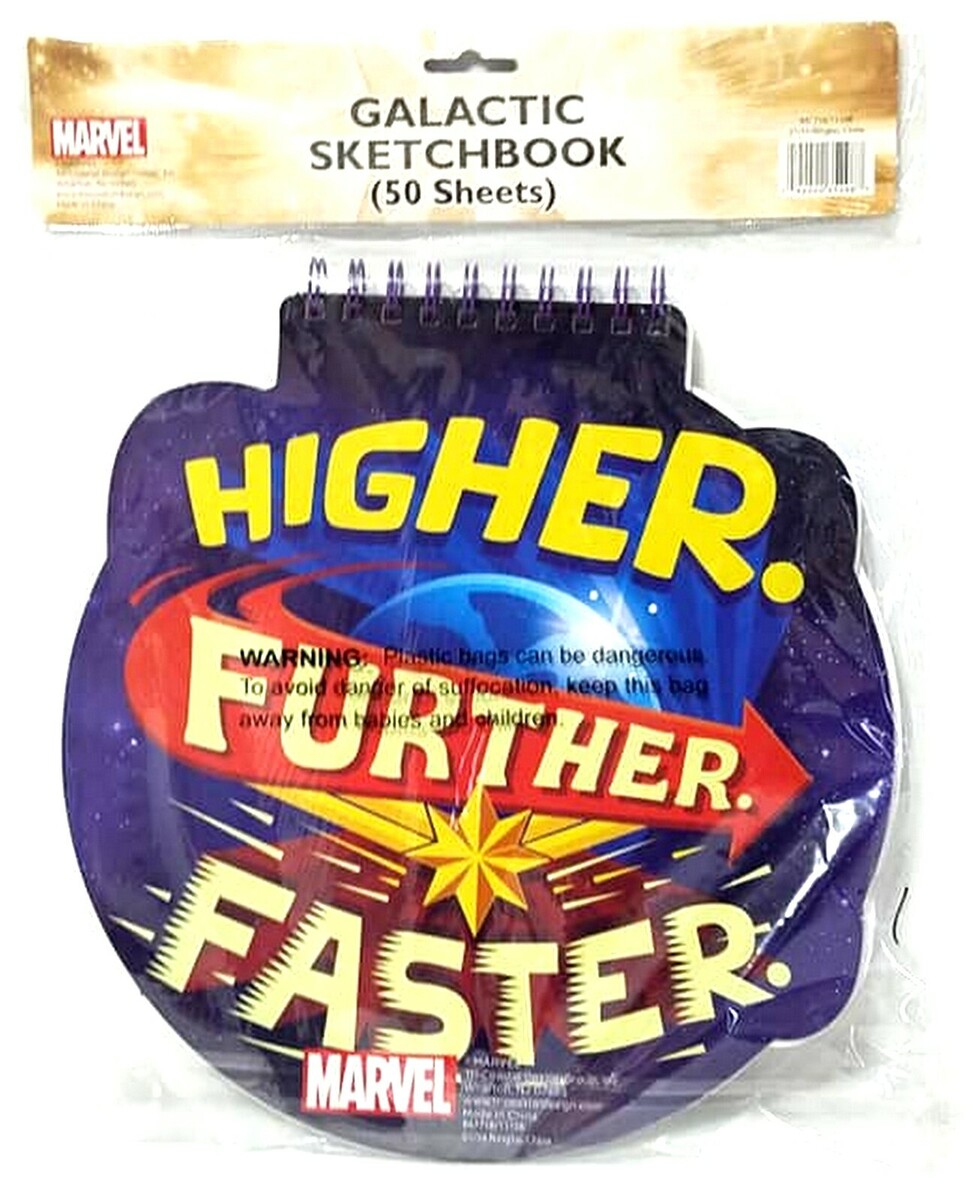 The Marvel Captain Marvel Galactic Sketchbook is a 10x11 inch spiral notebook with 50 sheets, perfect for drawing and lettering. The multicolor cover features a Galactic design, making it a unique and adventurous choice for artists and crafters. Made in China, this sketchbook is part of the Marvel brand collection, adding a touch of excitement and creativity to your art supplies.