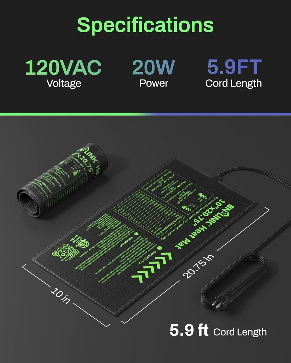 Safety Reliability: Listed for quality assurance, our mats come with a 5.9ft power cord, efficiently running on just 20W. Compact design allows for easy storage and portability.