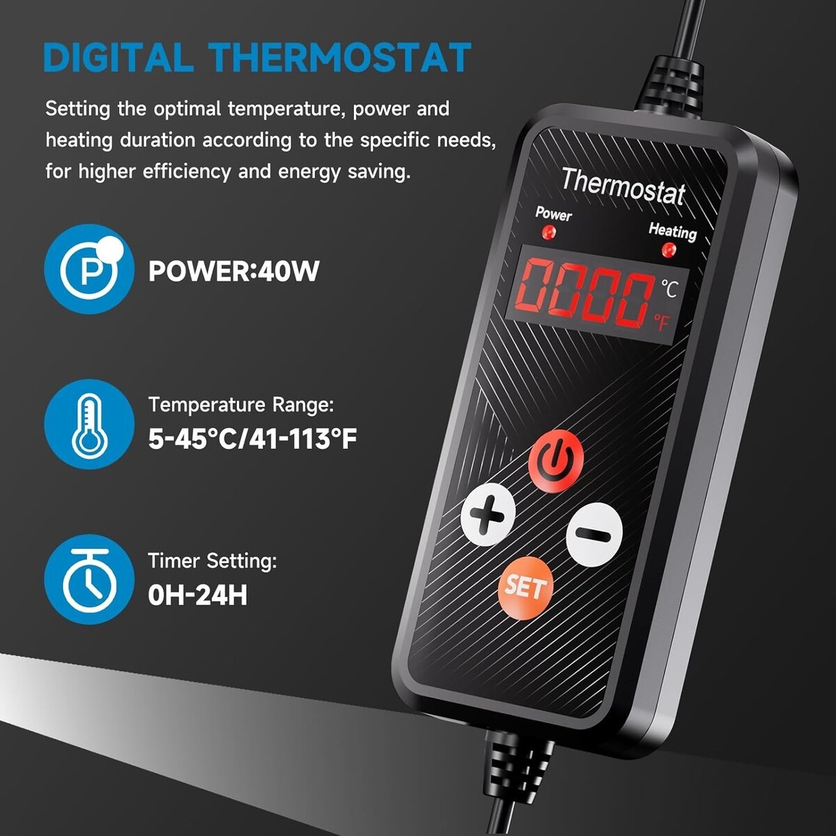 SIMPLE HEATING SETUP: User-friendly 4-button interface allows you to set a timer from 0H to 24H and adjust temperatures between 41-113? (5-45?) with a digital display supporting Fahrenheit and Celsius units.