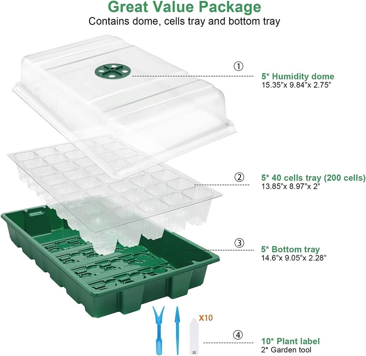 Comprehensive kit includes 5 x seed trays, 5 x bottom trays, 5 x humidity domes, 2 x garden tools, and 10 x plant labels, ensuring you have everything you need for successful seed germination.