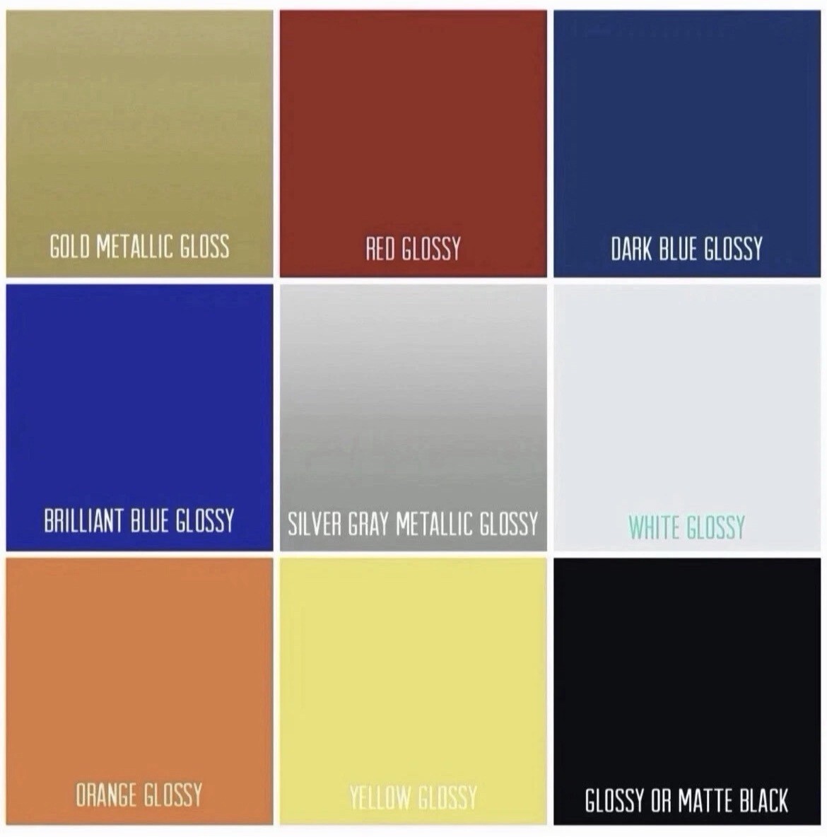 Available colors: (Glossy Black, Matte Black, Glossy Red, Glossy Yellow, Glossy Silver, Glossy Orange, Glossy Blue Glossy White)